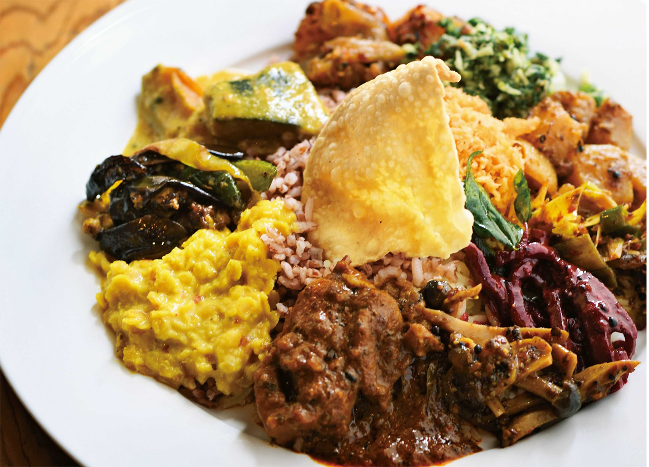 外資系のラグジュアリーホテルで長らくサービスを経験してきたバンダラさん夫妻が、スリランカ人のシェフを呼んで2018年にオープン。「スリランカ料理というとカレーばかりだと思われるけれど、いろいろな料理があることを知ってほしくて」という気持ちから、12種類以上ものさまざまなおかずが並ぶランチビュッフェ形式にしている。「油が少なく、野菜をたくさん使った家庭料理ばかり。たくさん食べても軽やかですよ」という言葉とおいしさに、ついおかわりしてしまうこと確実。美しい建物の雰囲気も心地よく、食後はデザートとスリランカの紅茶をいただきながらゆったりと過ごせる。