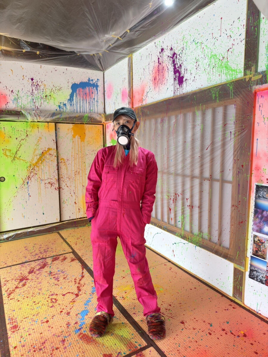 展覧会の制作現場でのひとコマ。自ら防毒マスクを装着し、古民家の空間を色とりどりのペンキで染め上げていった。