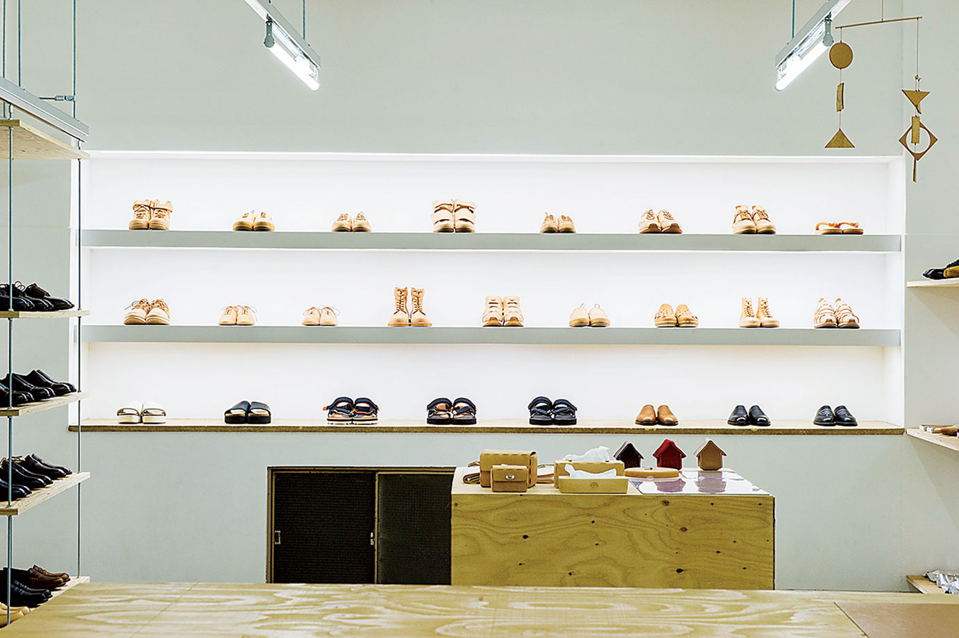 アイコニックなヌーディーカラーや、漆黒のレザーシューズが棚に並ぶ。