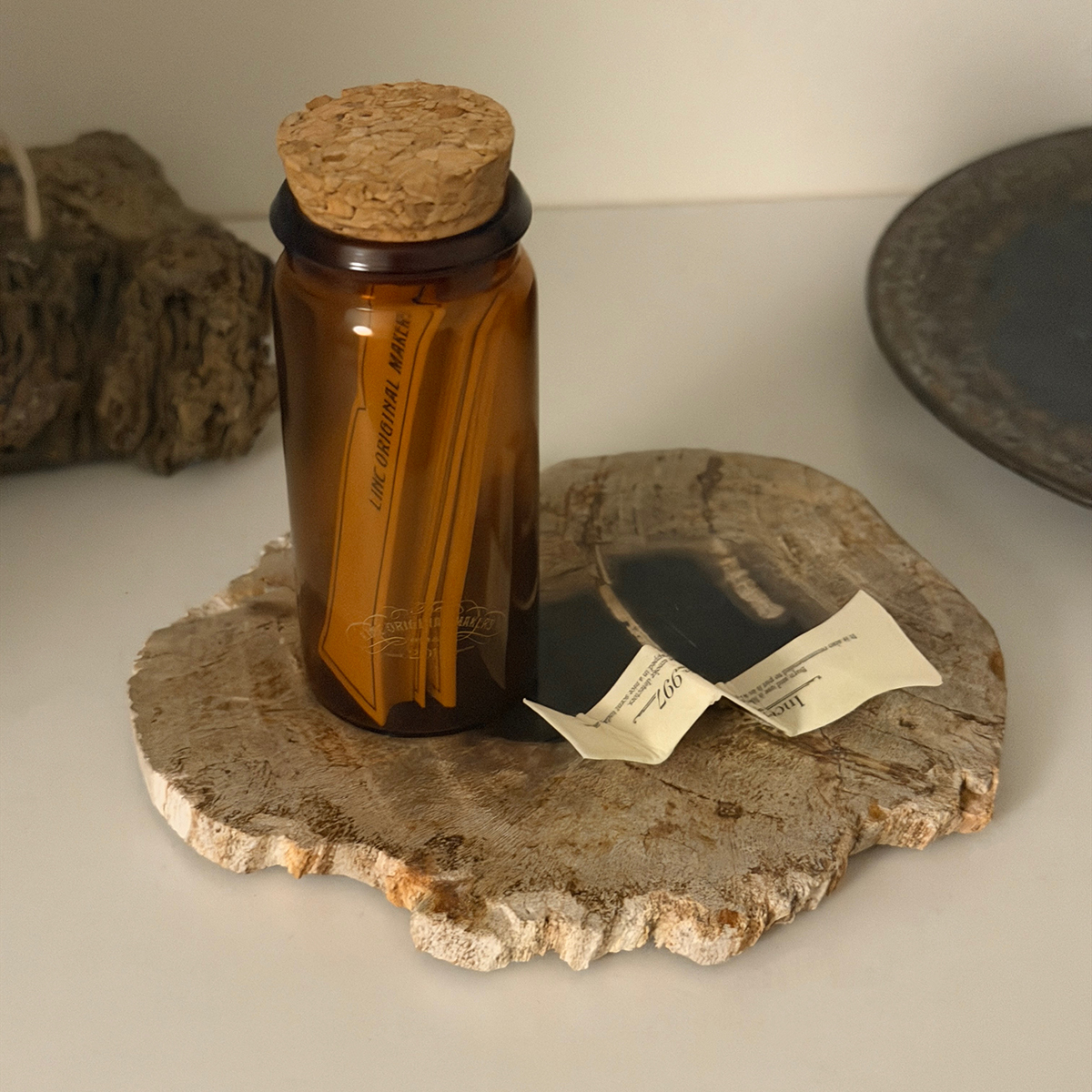まず心を掴まれたのは、ヴィンテージライクな瓶に入ったミニマルな佇まい。インテリアにも自然と馴染み、置いてあるだけで気分上げてくれる存在です。