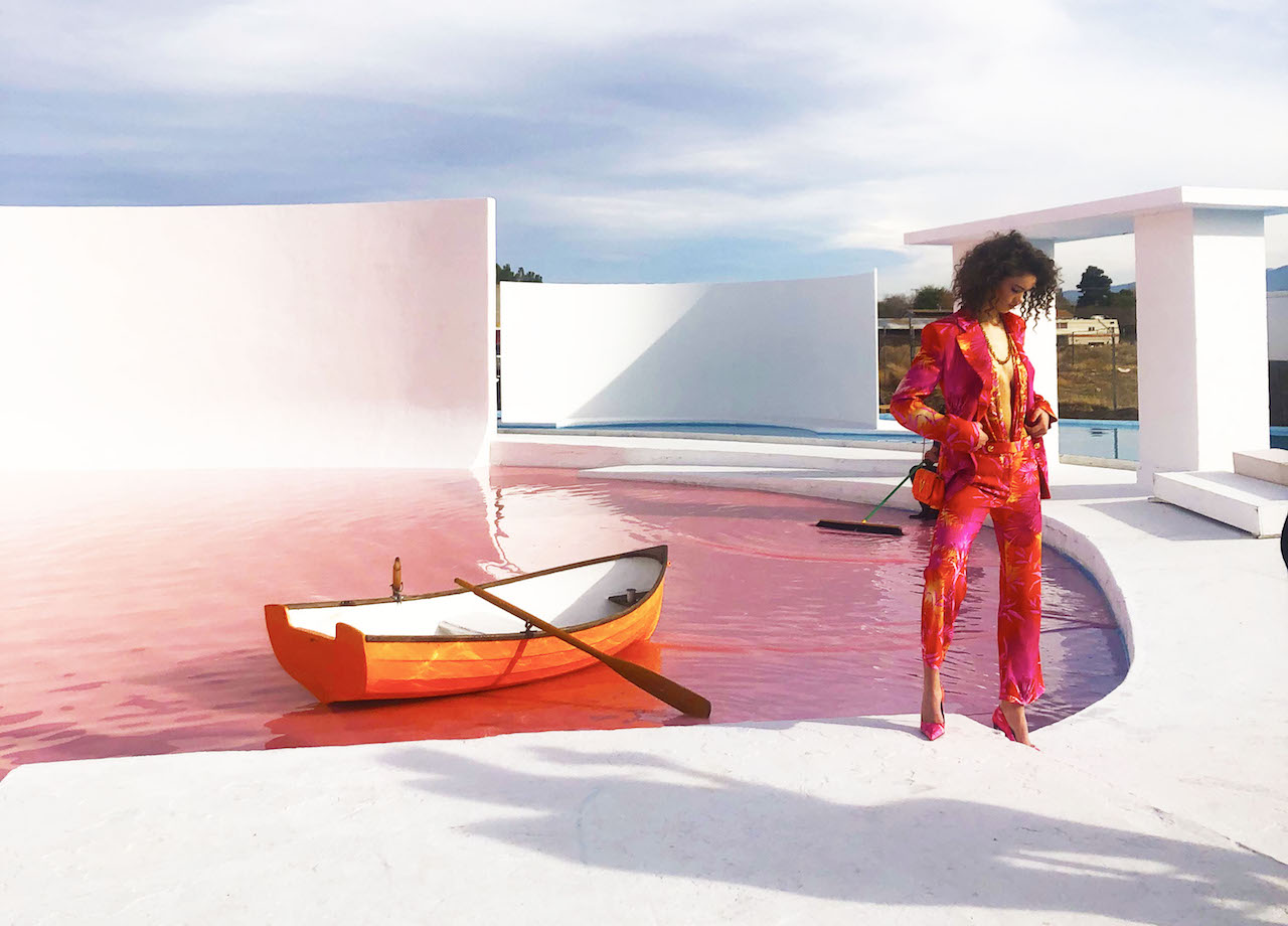 完成したのは、「パラダイス」をテーマに集めた洋服たちと見事にマッチするピンク×ブルーのプール。セットは極寒の地からすっかり”パラダイス”なビジュアルに!