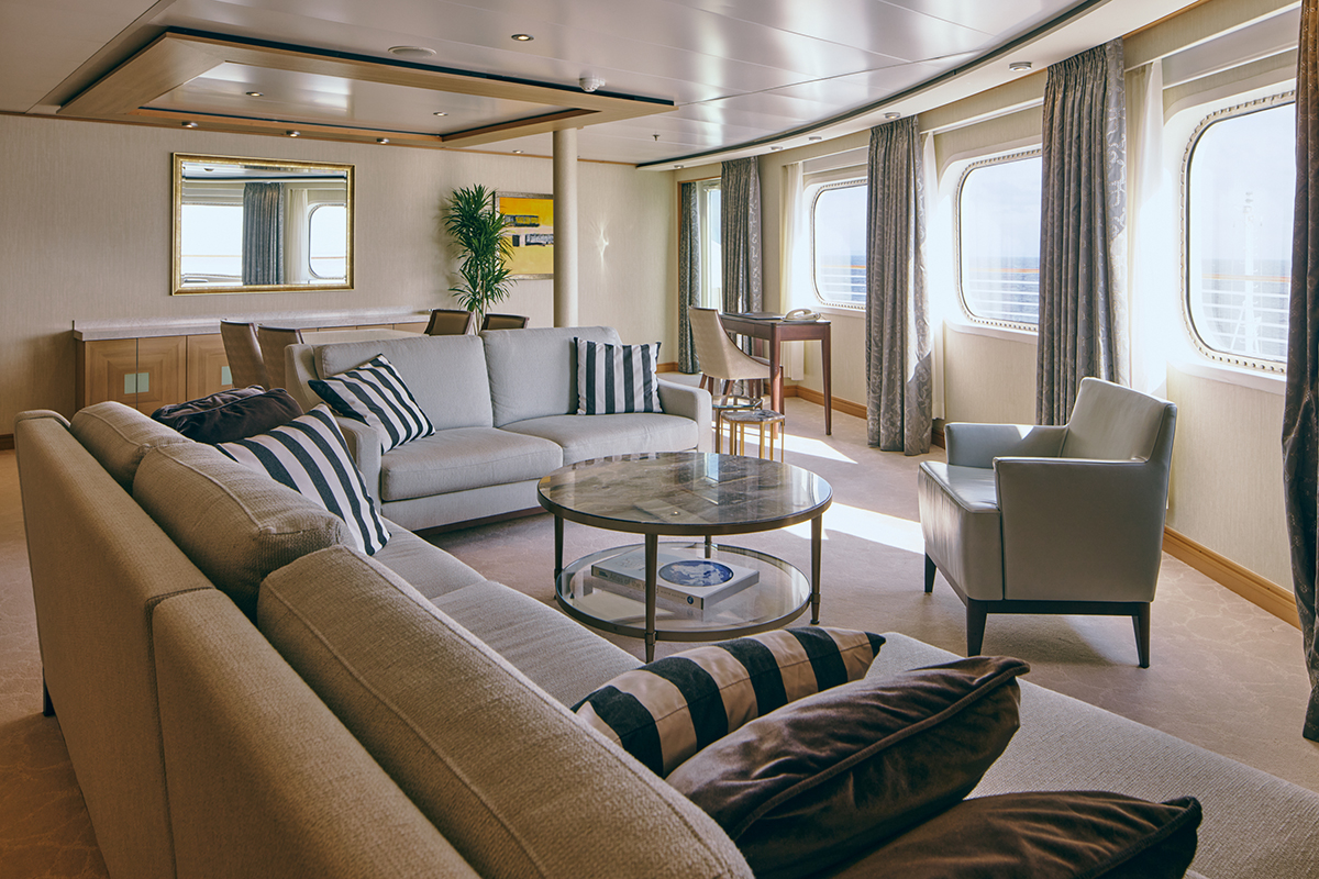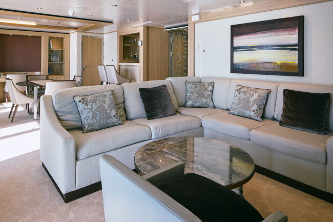 続くシグネチャースイートは船首近くに位置し、緩やかにカーブを描く窓から光が差し込む、三角形のリビングが特徴です。ダイニングテーブルやソファを備え、ゆったりとくつろげる空間になっています。ベランダも広く、開放感たっぷり。87平方メートルと、船内で最も広い客室です。