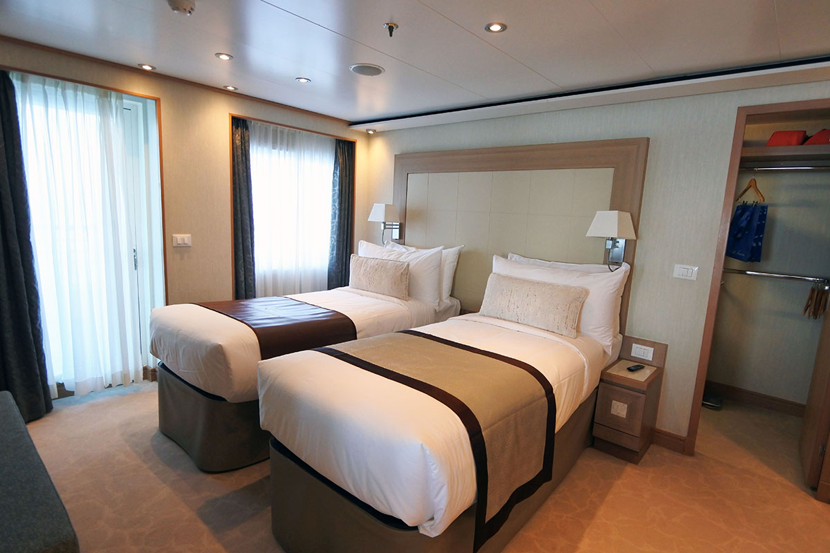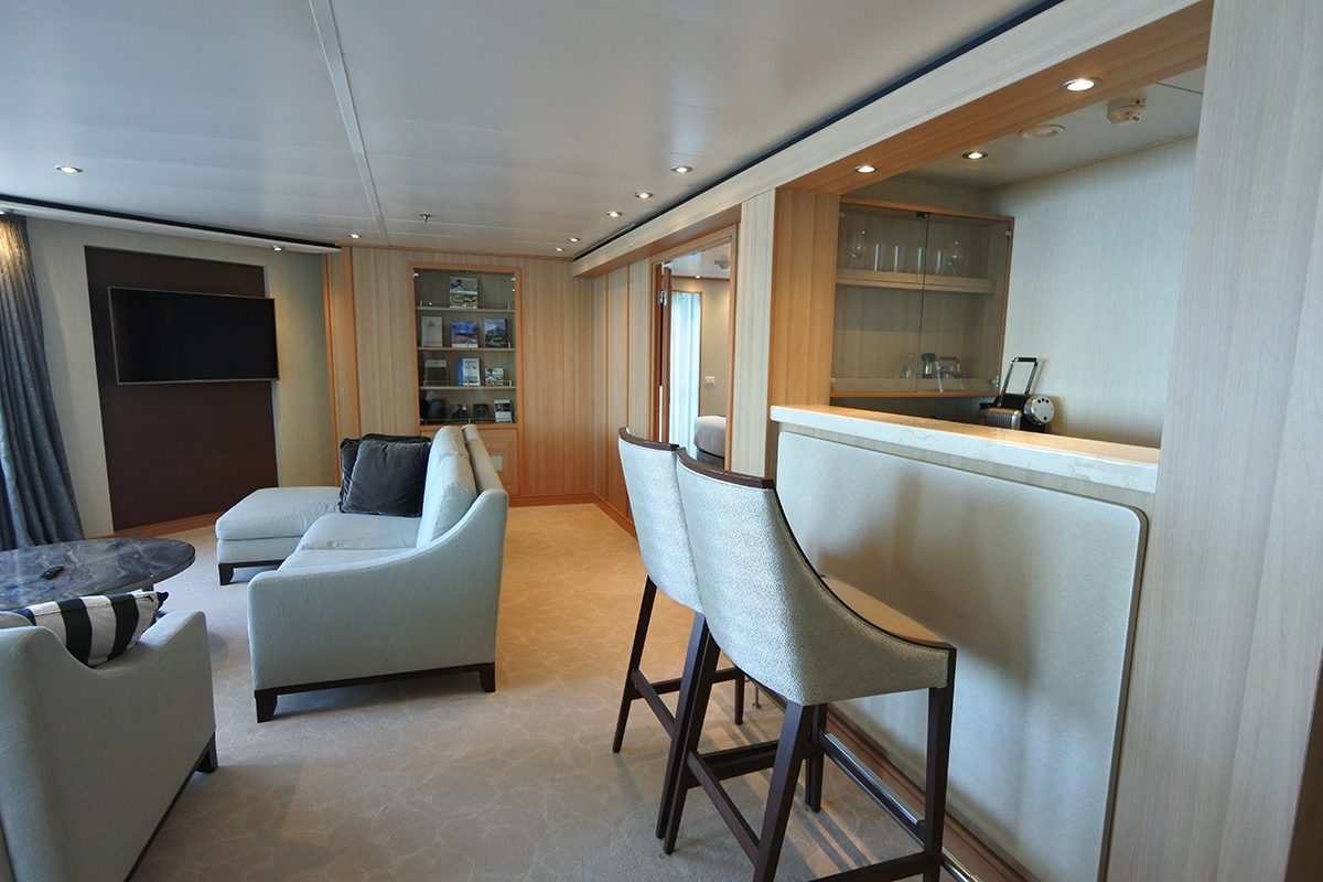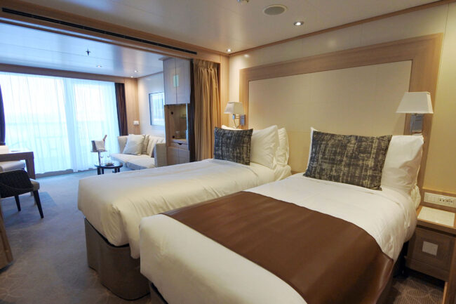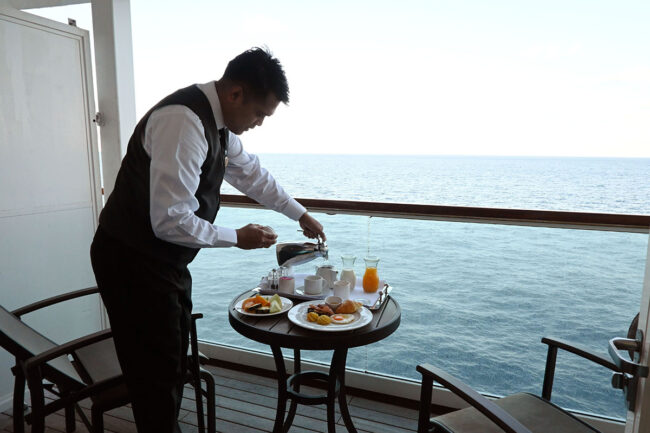 まず、バトラーサービスが受けられます。お出迎えの挨拶から始まり、ウェルカムシャンパンとスーツケースの荷ほどき(下船時の荷造りも)のお手伝い、寄港地観光ツアーや有料のレストランの手配、スパの予約などもお願いできます。