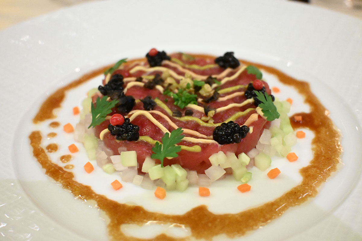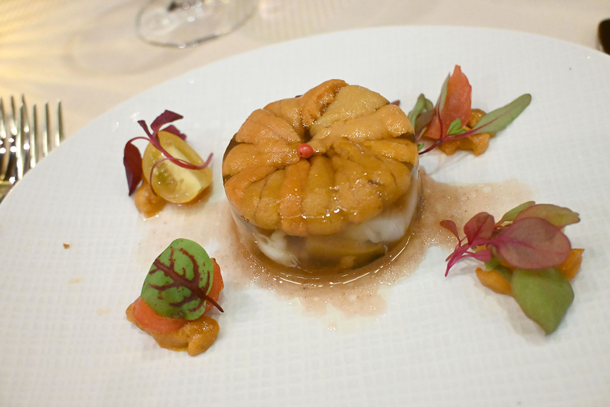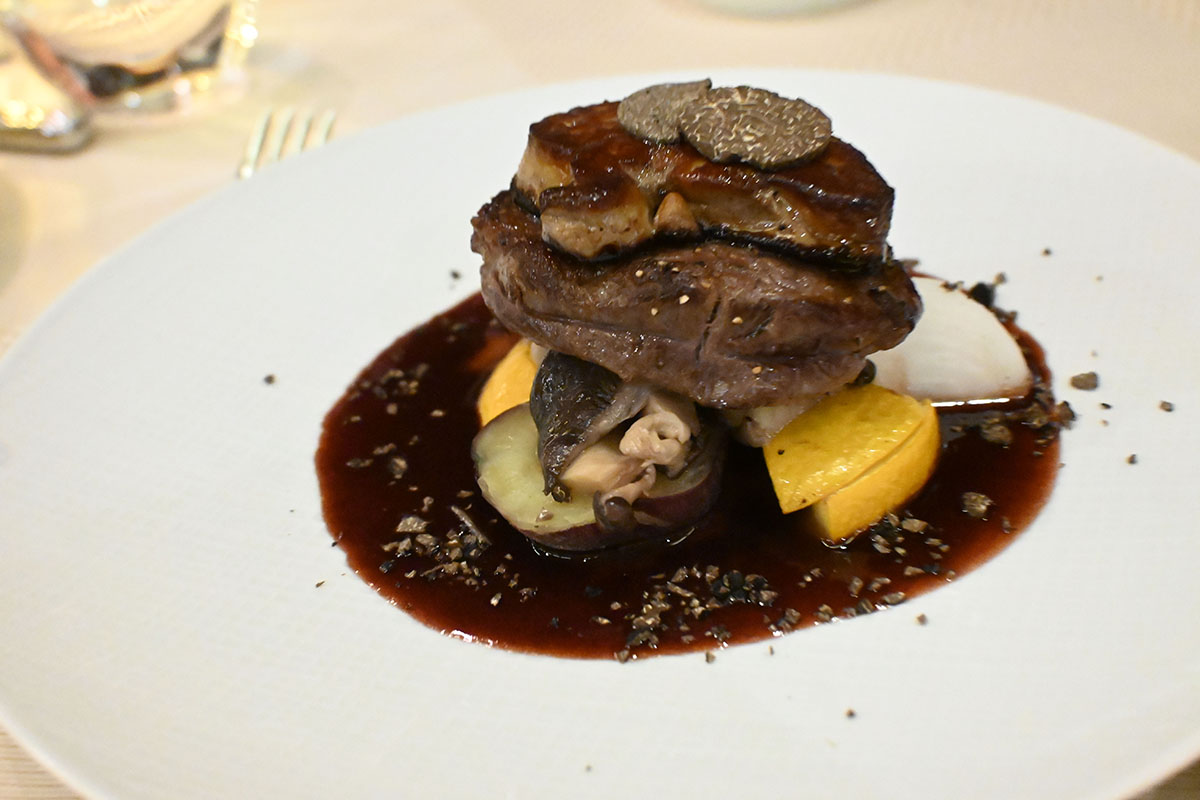 今回のクルーズでのプリフィックスメニューは、オマール海老やフォアグラ、蝦夷鮑に和牛フィレ肉など、季節の最高食材が次から次へと美しい皿となって、目の前に運ばれてきました。あまりの美しさにうっとりとため息。ちなみに、メニューは年に2回、季節に合わせて更新されます。