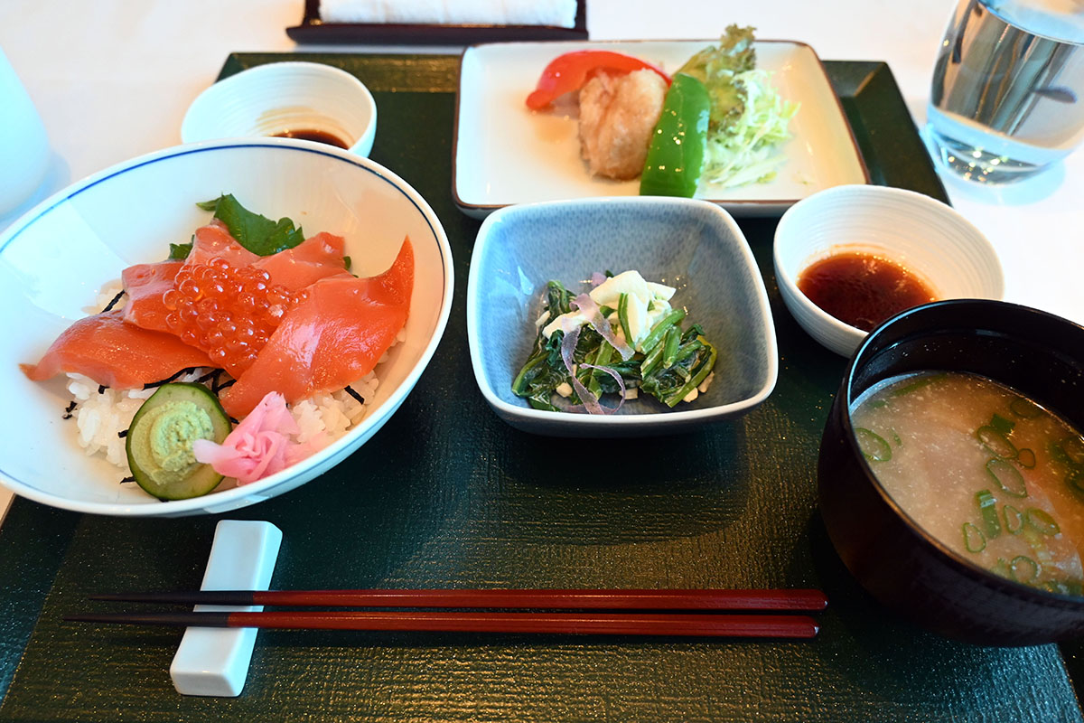 たとえばある日の「ザ・レストラン 富士」のランチメニューは、鶏肉唐揚げ 香味だれ、小松菜とはんぺんの山葵チーズ和え、漬けサーモンといくら丼、けんちん汁に柚子ゼリー。気に入ったメニューは再度オーダーすることもできます。