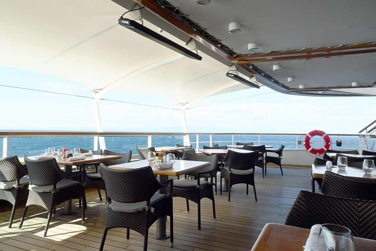 「テラスレストラン 八葉」は、船尾を向いた屋外のテラス席もあります。晴れた日のランチは、白く流れる航跡を眺めながら、食事が楽しめます。
