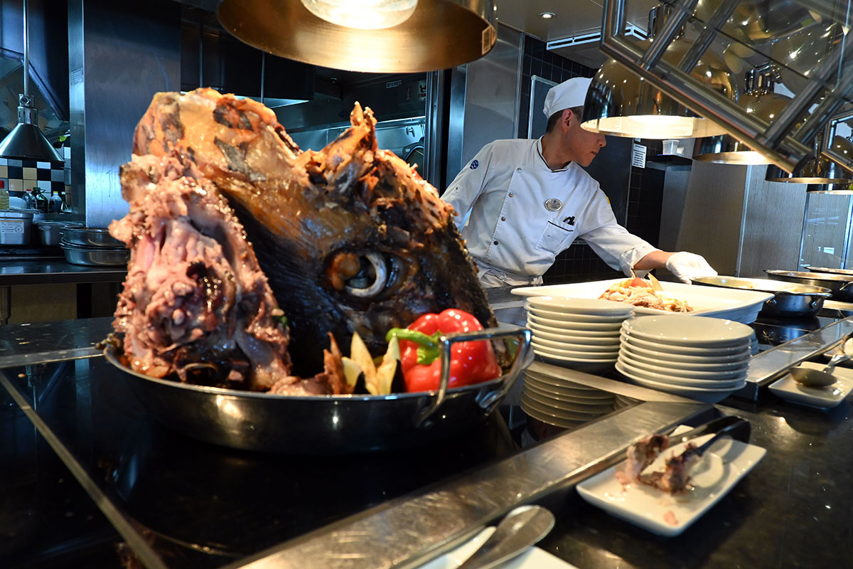 注目は、マグロのかぶと焼き。日本食に目が行ってしまいがちですが、イタリアンや中華などバラエティ豊か。サラダも充実しています。また、「テラスレストラン 八葉」では有料でおまかせのお寿司もオーダーできます。