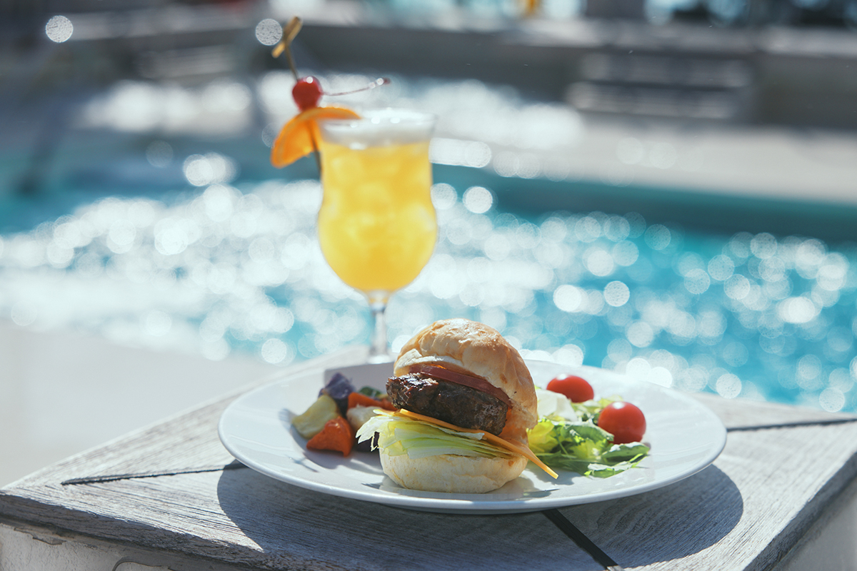 カジュアルな雰囲気で食事を楽しむなら「プールサイドレストラン&バー 湖畔」。湖のほとりのピクニックのような、リラックスした雰囲気から名づけられたとか。ここのミニハンバーガーは食べておかないと!