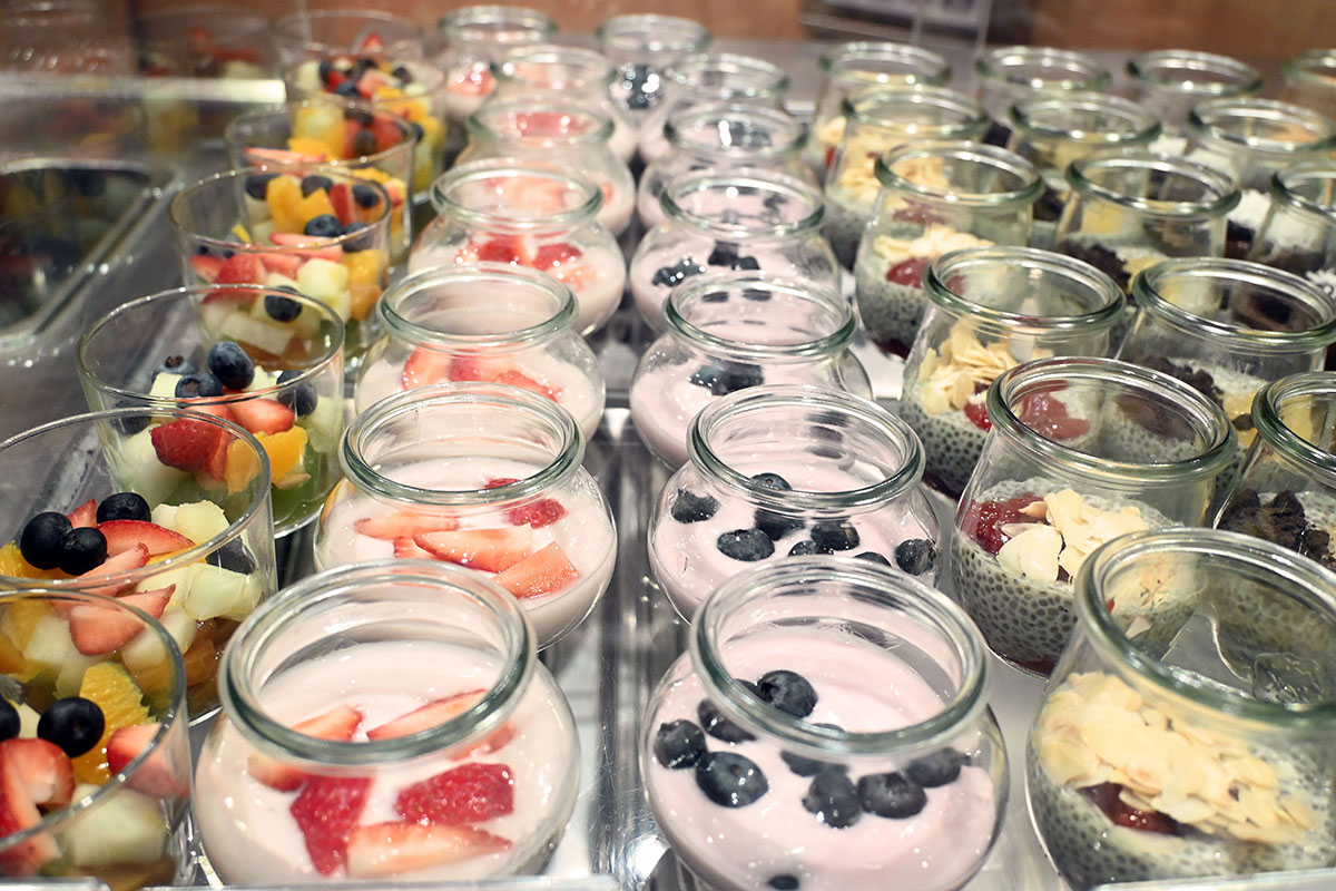 カフェコーナーのショーケースには、朝はヨーグルトやスムージーが並び、午後はペーストリーやスイーツがラインナップされ、時間帯によって内容が変わります。