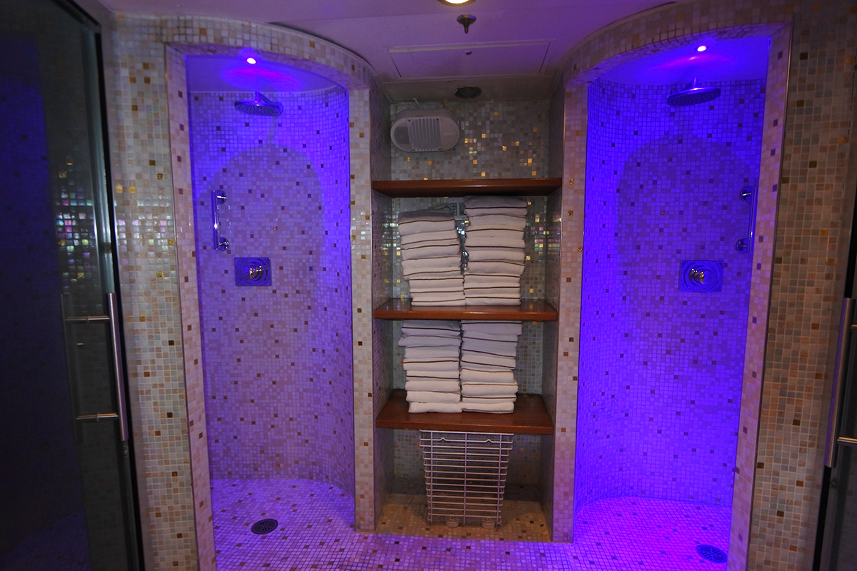 スパの中央に位置するエレガントな雰囲気のハーモニーラウンジには、ドライ&ウェットサウナや温感ベッドなどリラックス施設(有料)が揃っています。にっぽん丸の常連だというゲストいわく、「寄港地観光ツアーの後に毎日利用したいから、通しの利用券を購入したわ」とのこと。
