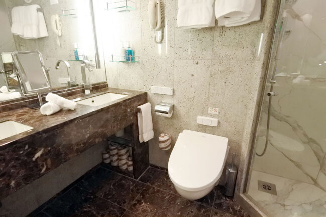 最も部屋数の多い客室は、ベランダスイート。ドアをあけて、最初にバスルーム&トイレ。ダブルシンクで、シャワーブース(レインとハンド)と肩まで浸かれるバスタブが別々になっています。そして温水洗浄便座付きトイレも。水回りがしっかりしているのは、嬉しいポイントです。