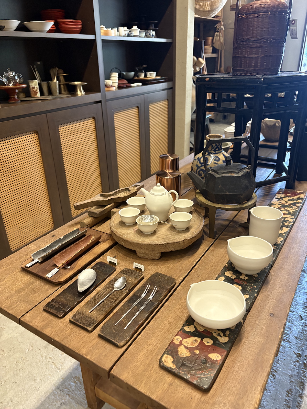 雲南省のれんげ、ミャンマーの漆器、インドの石皿、タイのかご、ラオスの円卓……アジア各地の暮らしに根ざした雑貨や家具、食器などが販売されています。