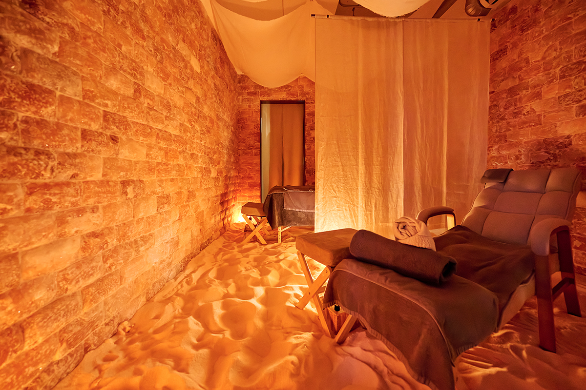 最大2名まで入室可能で、ベッドまたはチェアでの施術を選べます。洞窟内はエアコンやヒーターの熱とは違う、まどろむような暖かさで、こわばった体の緊張が解けていくような深いリラックス状態に。