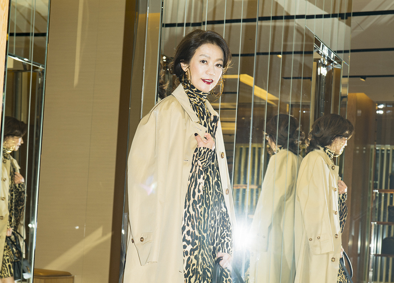 自分の中でヒョウ柄気分が再燃しているという田中杏子。ヒョウ柄ドレスにレディ感のあるバッグ、大きめのピアス、赤のシューズを合わせた。「ヒョウ柄は着るだけでモード感が上がる便利な柄です。カーコート(でもライナーはヒョウ柄!)をオンすれば、上品で落ち着いた印象に。レディな雰囲気にしたく、クラシカルな形の『TBバッグ』にシューズで赤を入れました。バッグのクラスプと大きめピアスでゴールドを効かせたのもポイントです」。