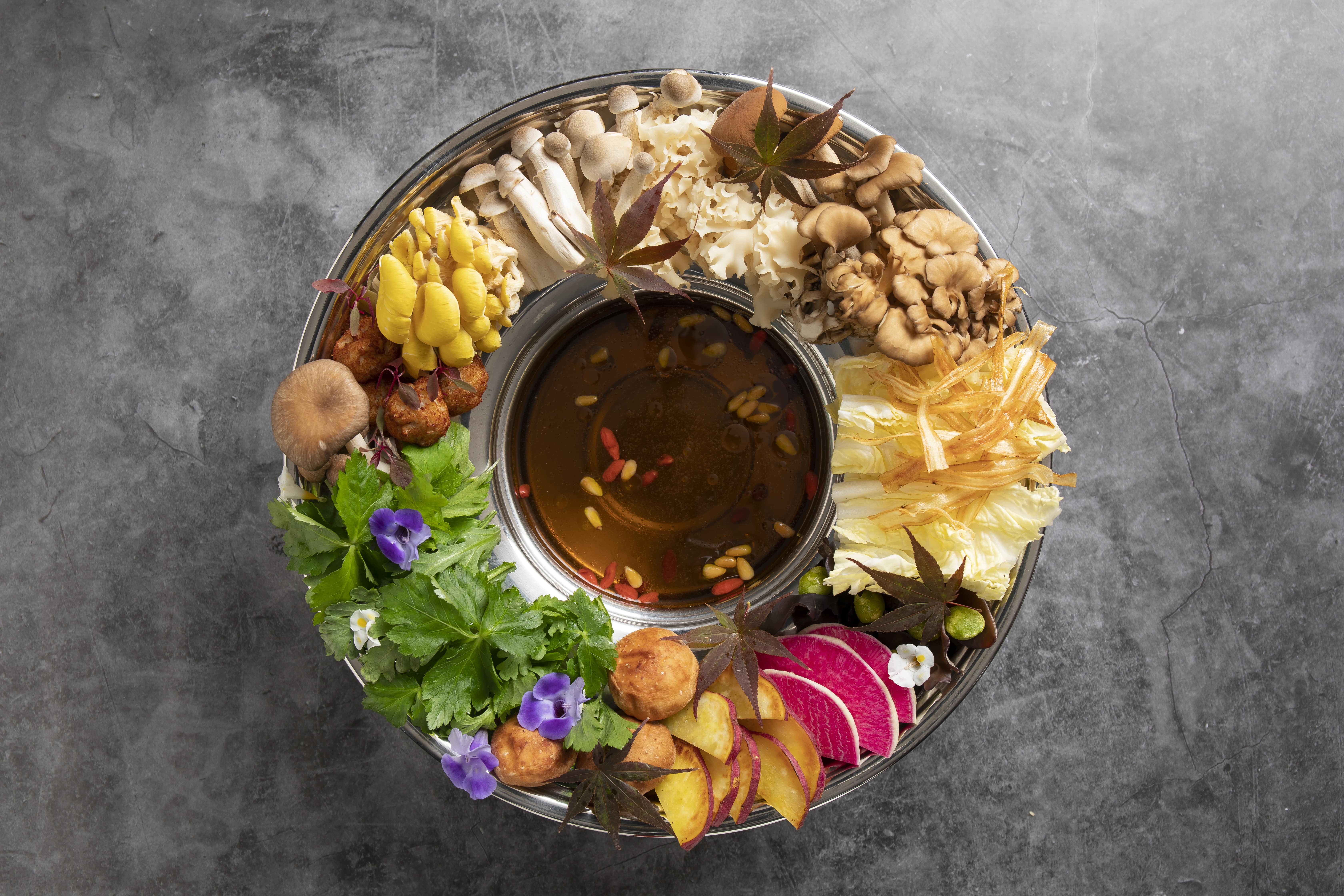 その名も「精進花鍋」。ベトナム南部で古くから食べられている食用花を使った鍋料理“花鍋”を「Hyssop」流にアレンジし、漢方や薬膳の要素を取り入れたもの。レシピ監修は、麻布十番にあるミシュラン一つ星「スブリム」で副料理長を務めた北嶋竜樹氏が担当。見た目にもエキゾチック&カラフルで美しい!