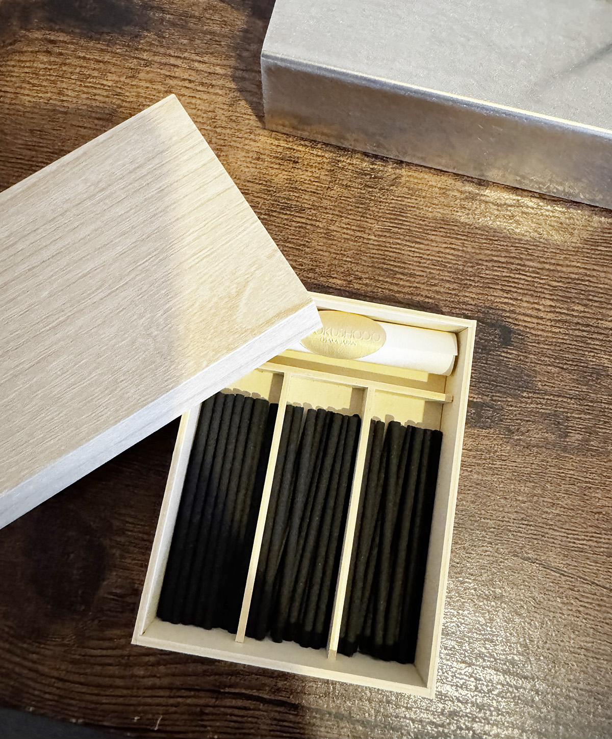 空気にすっと溶けていくような軽さがあって、職人によってひとつひとつ手作業で作られたお香は、自分だけの時間にぴったり。木箱のような紙製のパッケージも美しく、ちょっとしたギフトにもおすすめです。