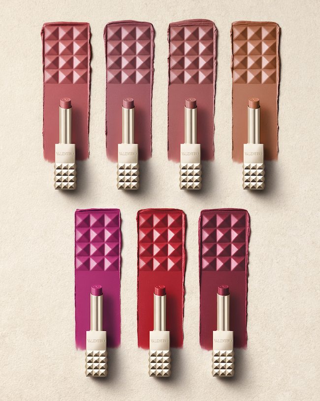 アイコニックなスタッズで覆われたゴールドのパッケージは、ヴァレンティノ ガラヴァーニのバッグコレクション「ロックスタッズ スパイク」からインスパイア。スムーズなマグネット式のキャップを外すと現れるスリムなリップスティックは、サステナビリティへの配慮の観点から6色をレフィル展開する。