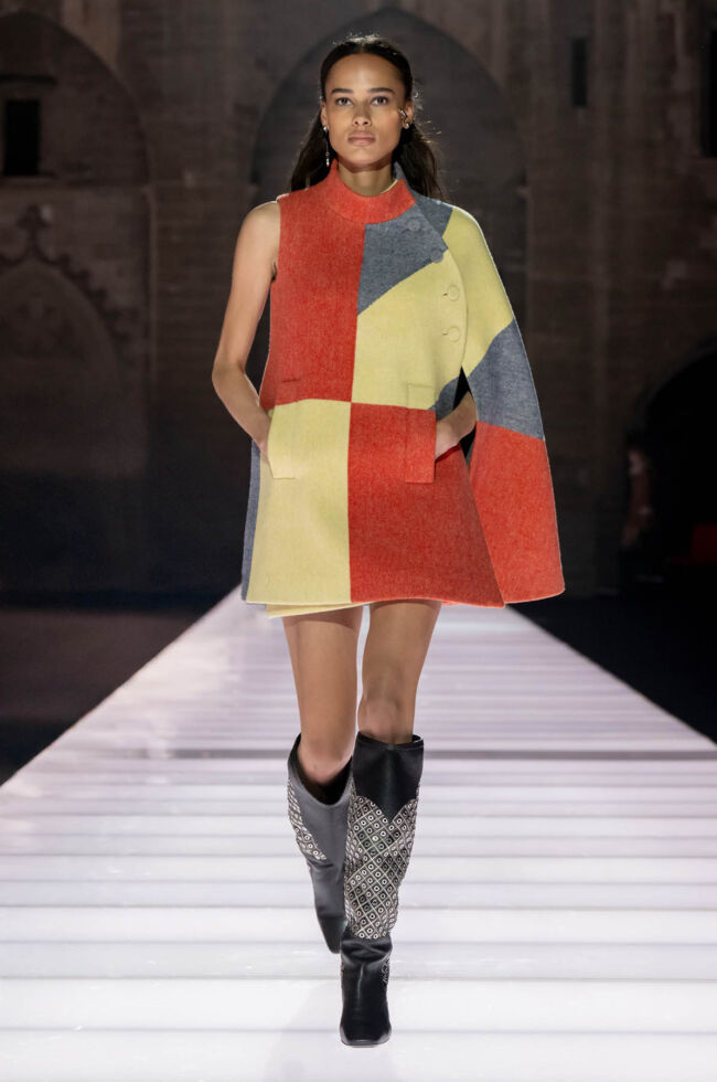 色彩はブラック、グレー、ブラウンなどのニュートラルカラーに、オレンジ、グリーン、マゼンタなどの鮮やかな色を組み合わせたカラーブロッキングが目立った。