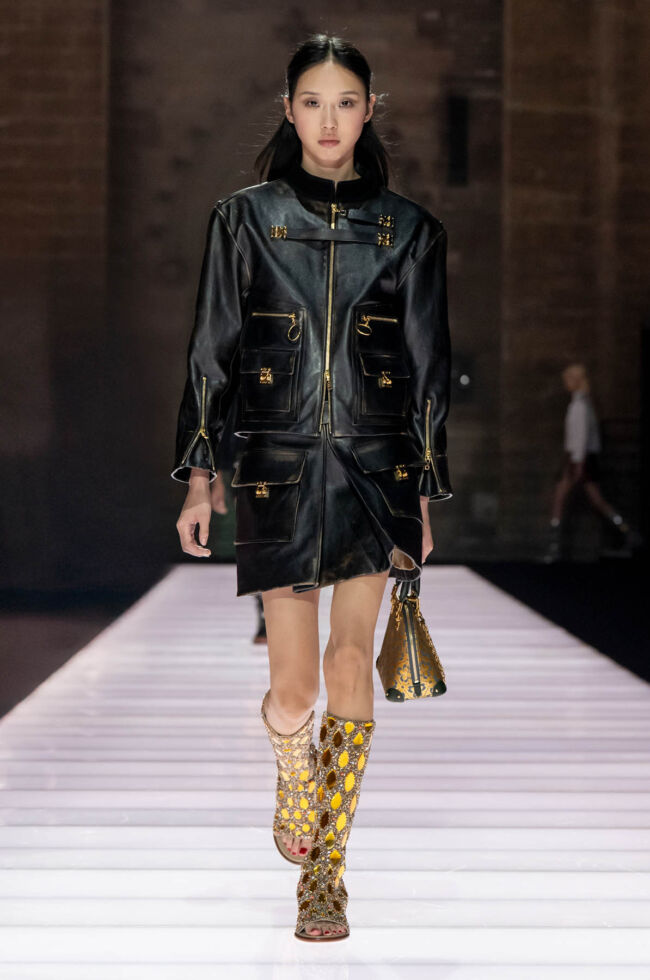 中世の荘厳さと現代的なエッジが融合したルックが印象的で、メタリックのスーツジャケット、炎のようなパターンのケープなど、ドラマティックなアイテムが際立った。軽やかで自由なムードを演出するドレス、中世の宗教的な装飾を思わせる豪華な刺繍や金の装飾が施されたコートなどが次々と登場。
