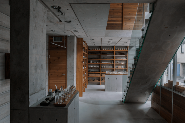 店内の中央に位置する階段を上って、2階へ。これまで立ち入れなかった2階には、手を洗うためのシンクを配置。感性に届くボディケア製品を存分に試すことができるほか、天窓から光が差し、開放的な空間を堪能できる。そして何よりも一番大切な「ラボ」を、今回前面にもってくることで、フレッシュ ブレンディングされていく様子を通りの外からも見ることができるように。外に置かれた木製のベンチが、内と外との境界をつなぐ役割を果たす。