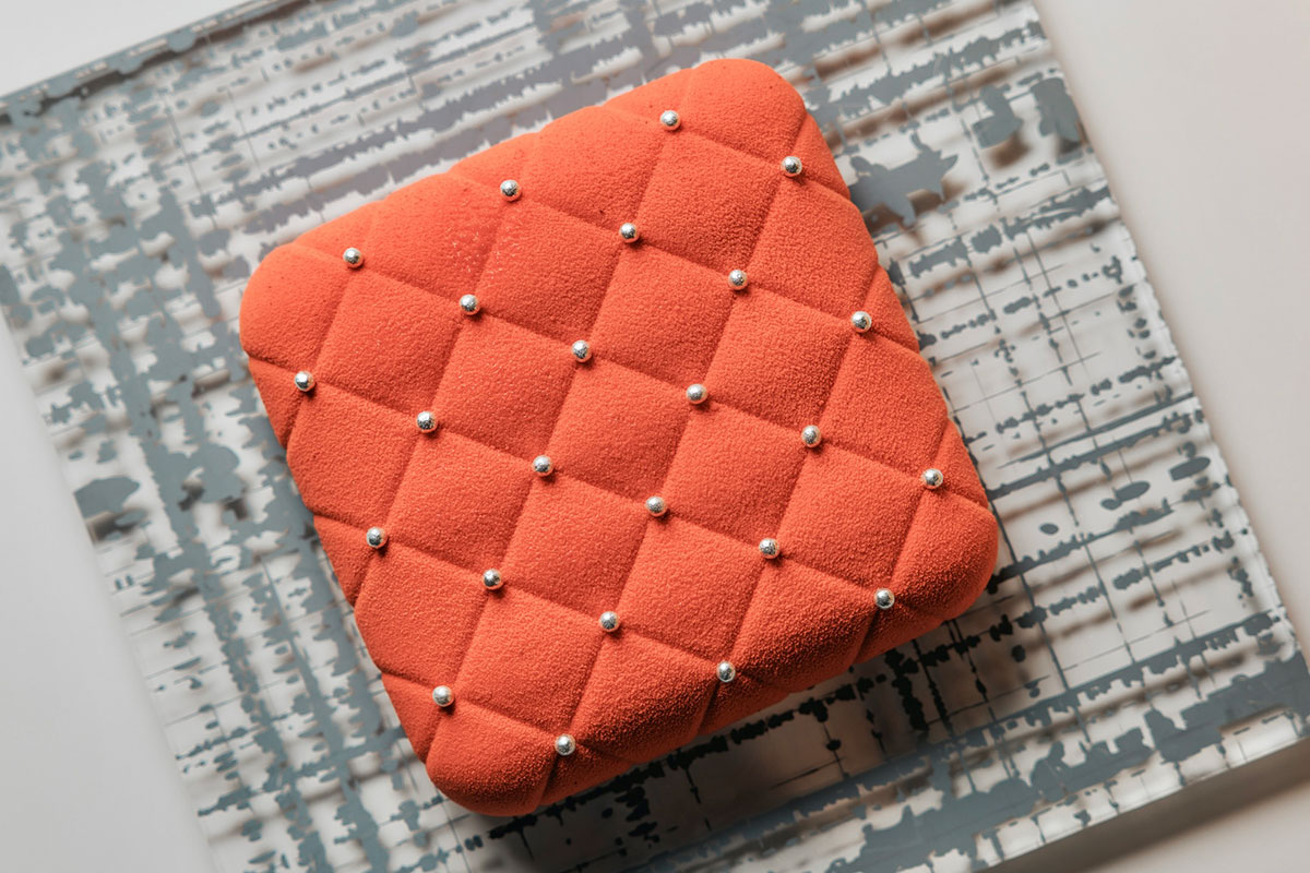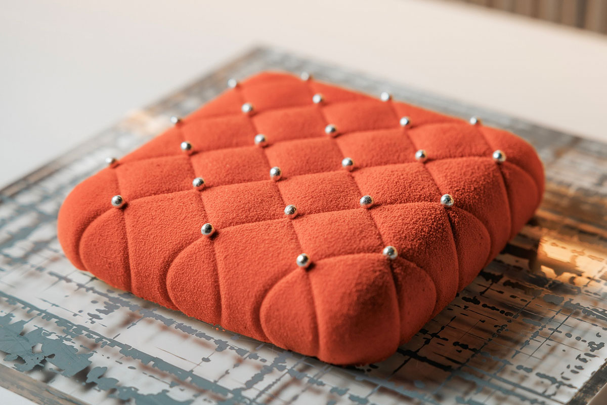 鮮やかなルージュカラーに、キルティングを思わせる印象的なデザインが目を引くアニバーサリーケーキ。香り高いマダガスカル産バニラを使ったなめらかなムースの中には、フランボワーズ、イチゴ、カシス、ブルーベリーの甘酸っぱいマーマレードと、ライムの爽やかな酸味が効いたジャムを忍ばせている。香ばしい自家製アーモンドプラリネや、サクサクとした食感のフィヤンティーヌ、フランボワーズ風味のビスキュイ生地を重ねることで、香り・味・食感が折り重なる、奥行きのある味わいに仕上がっている。