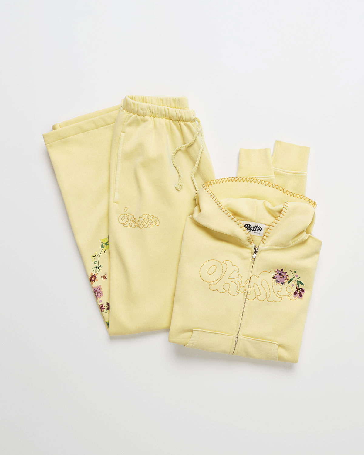 今回のコレクションでは、マッドハッピーの持ち味である温かみのあるパステルカラーや柔らかな素材感をベースに、オフィス キコらしいボヘミアン調のフローラルプリントや繊細な刺繍を散りばめたデザインが特徴。ウォッシュ加工によるヴィンテージライクな風合いが、両者の美意識を自然に融合させ、ナチュラルで遊び心のある世界観を生み出している。