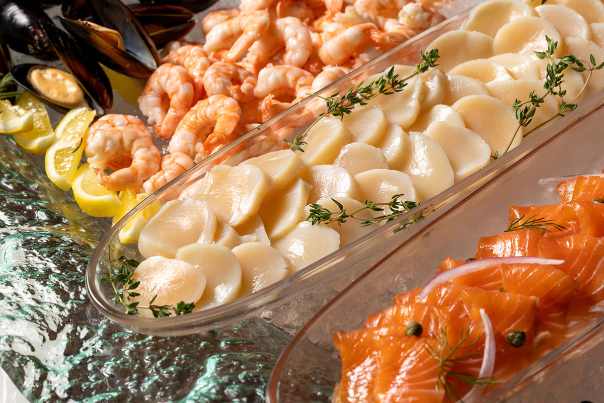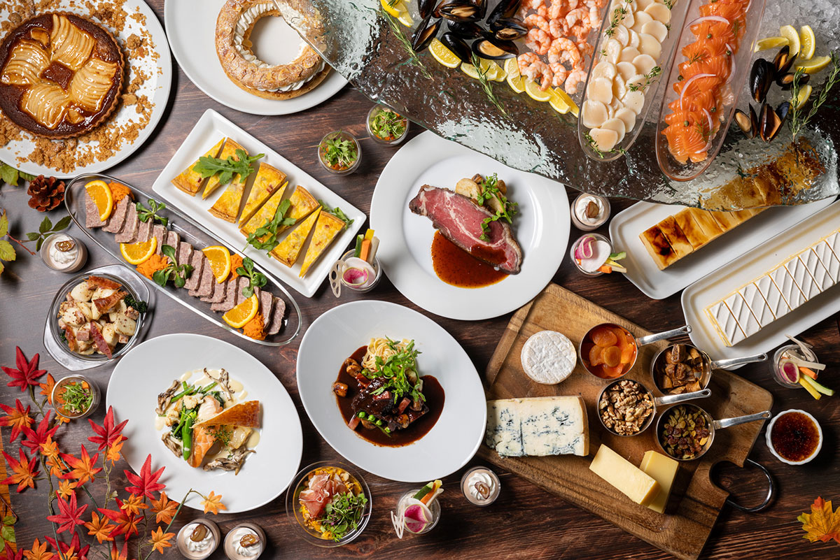 前菜ビュッフェには、秋野菜を使ったフランス定番の野菜の盛り合わせであるクリュディテや、栗とベーコンのキッシュなど、秋の食材をふんだんに使用したフランスで馴染み深い料理をラインナップ。また、昨年好評を博した、海老や自家製スモークサーモン、ムール貝、ホタテ貝など、海の幸を大胆に盛り付けたシーフードプラッターを限定で提供する。