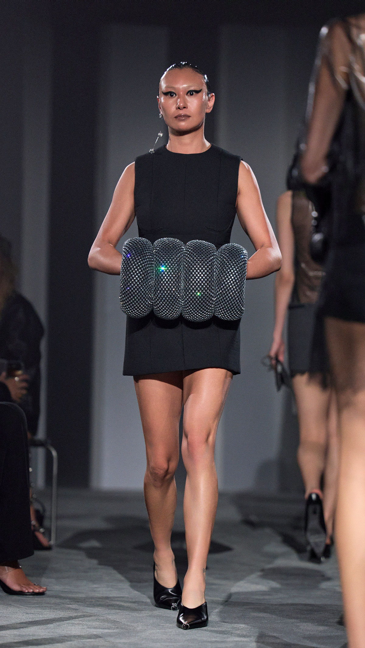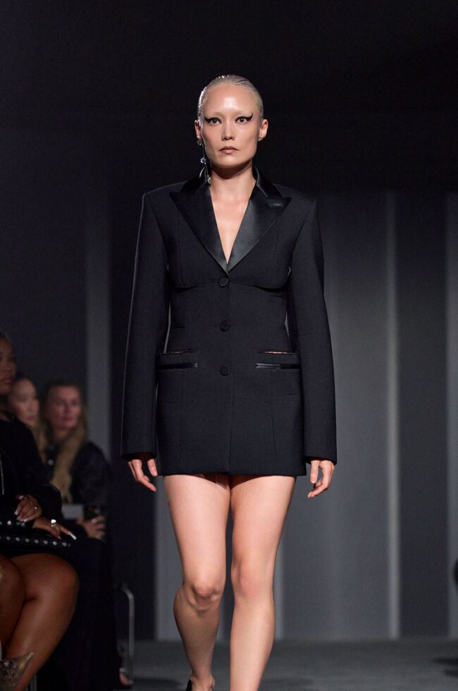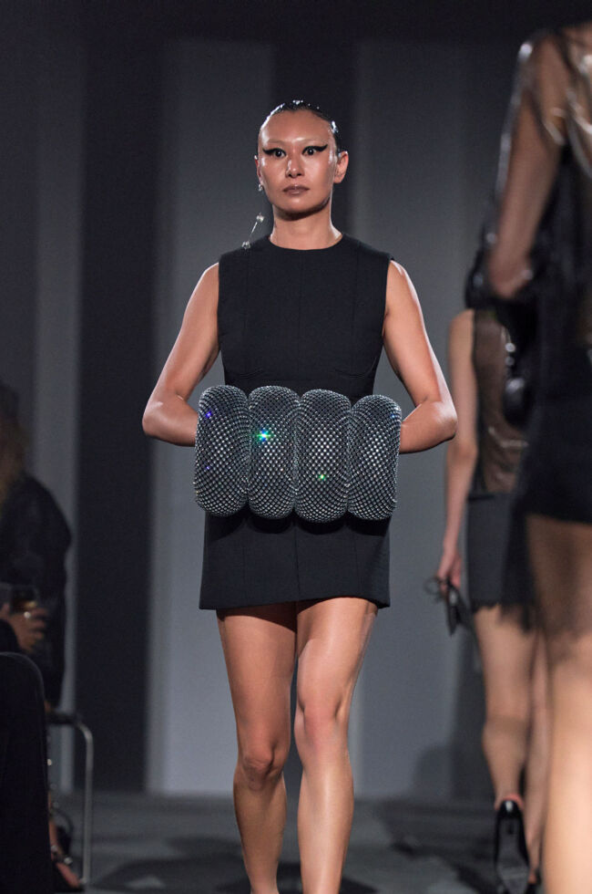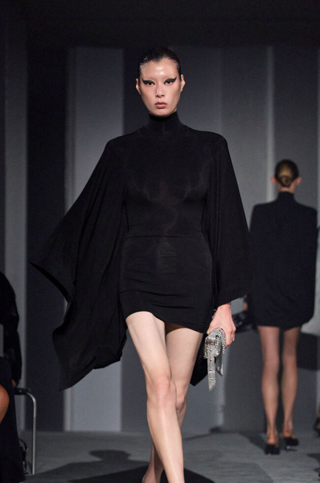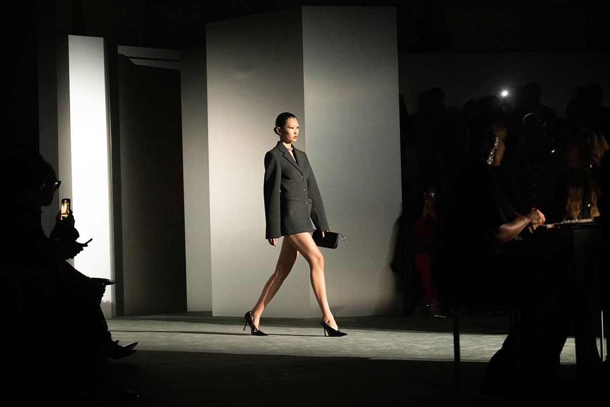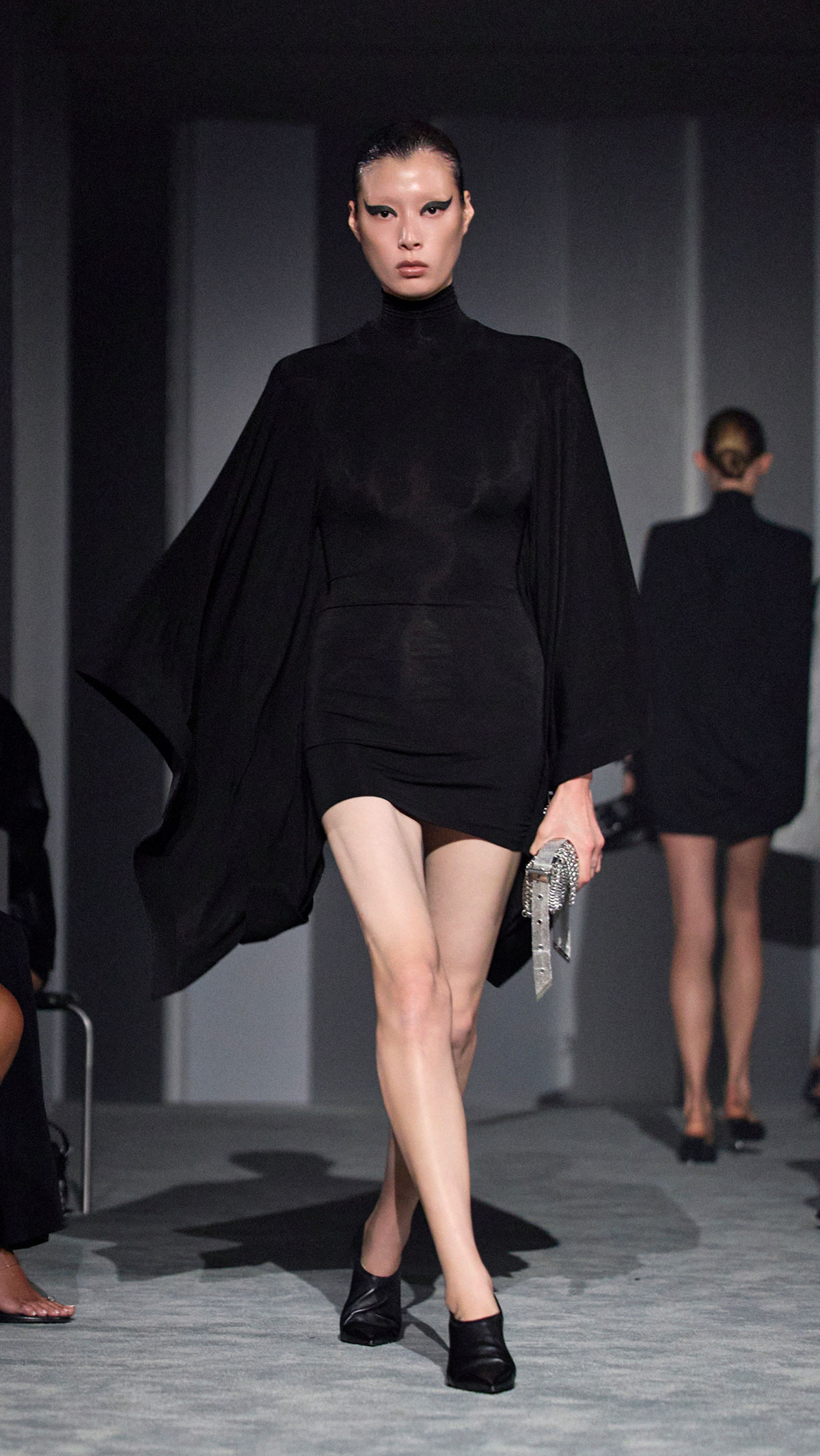 ファーストルックを飾ったのは、ブランドが追求してきた“パワードレッシング”を象徴する一着。ショーの中盤ではドローンによるスペクタクル演出により雰囲気が変化し、「ソフトとシャープ」の融合を表現したレーザーカットナイロンドレスや、新作ハンドバッグ「Siren」がブランドらしいシグネチャー・ハードウェアとともに登場した。