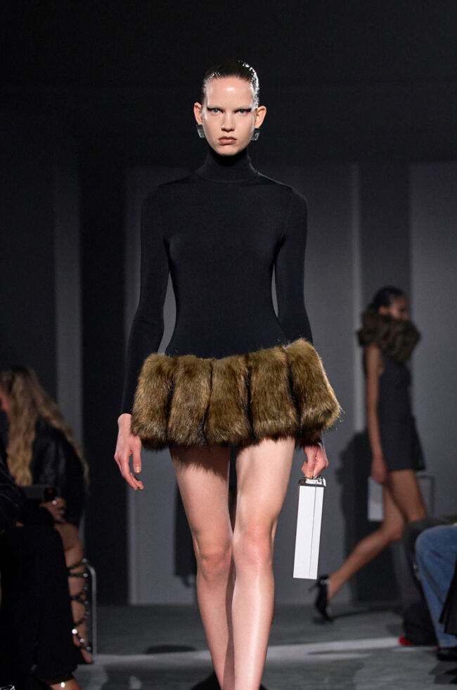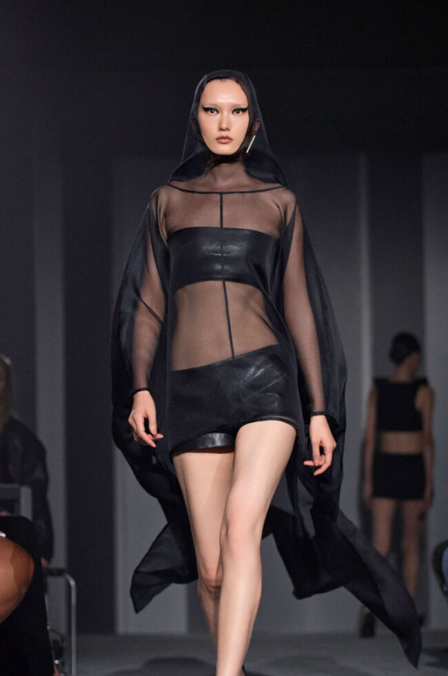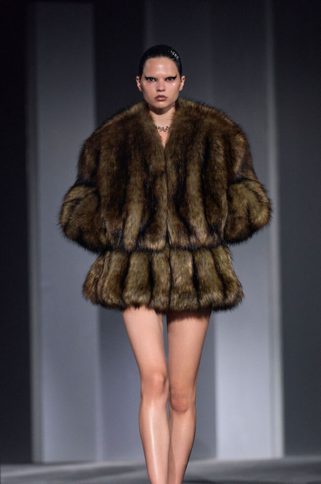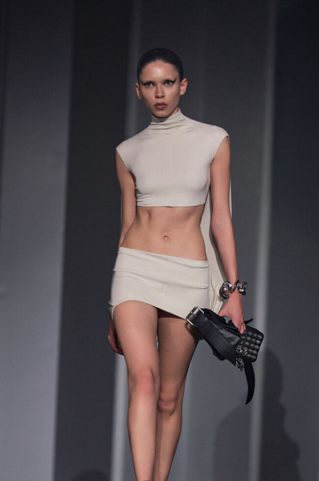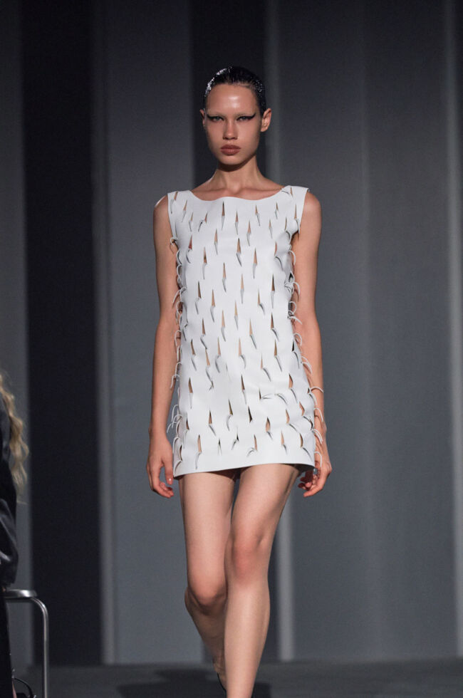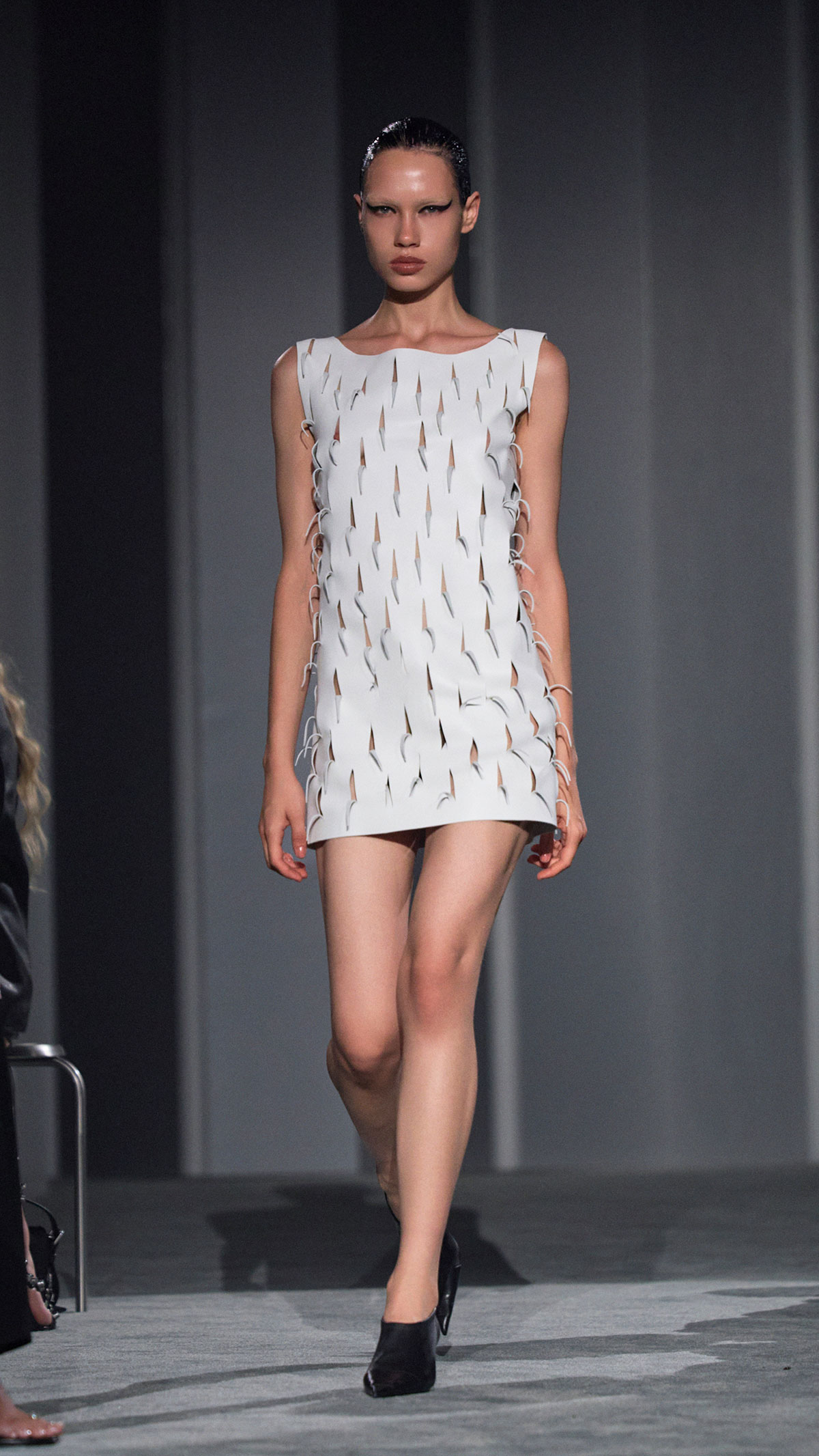 ファーストルックを飾ったのは、ブランドが追求してきた“パワードレッシング”を象徴する一着。ショーの中盤ではドローンによるスペクタクル演出により雰囲気が変化し、「ソフトとシャープ」の融合を表現したレーザーカットナイロンドレスや、新作ハンドバッグ「Siren」がブランドらしいシグネチャー・ハードウェアとともに登場した。