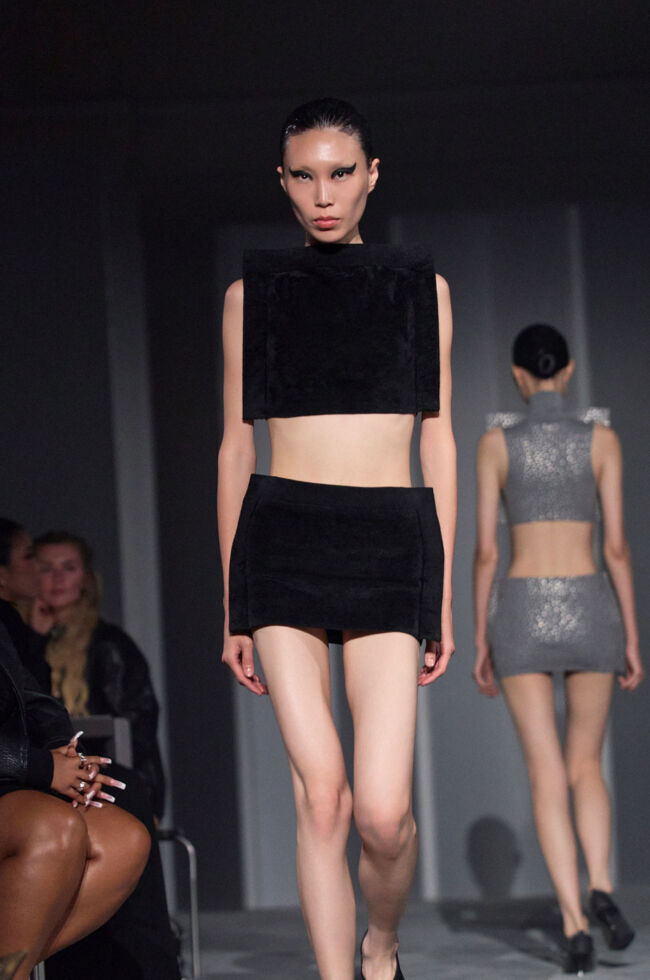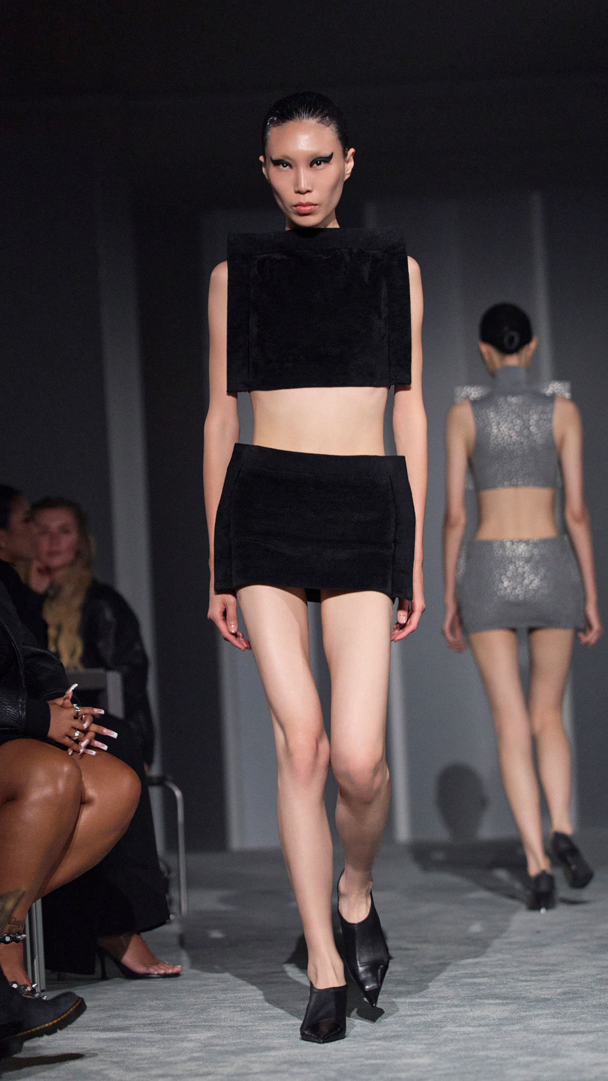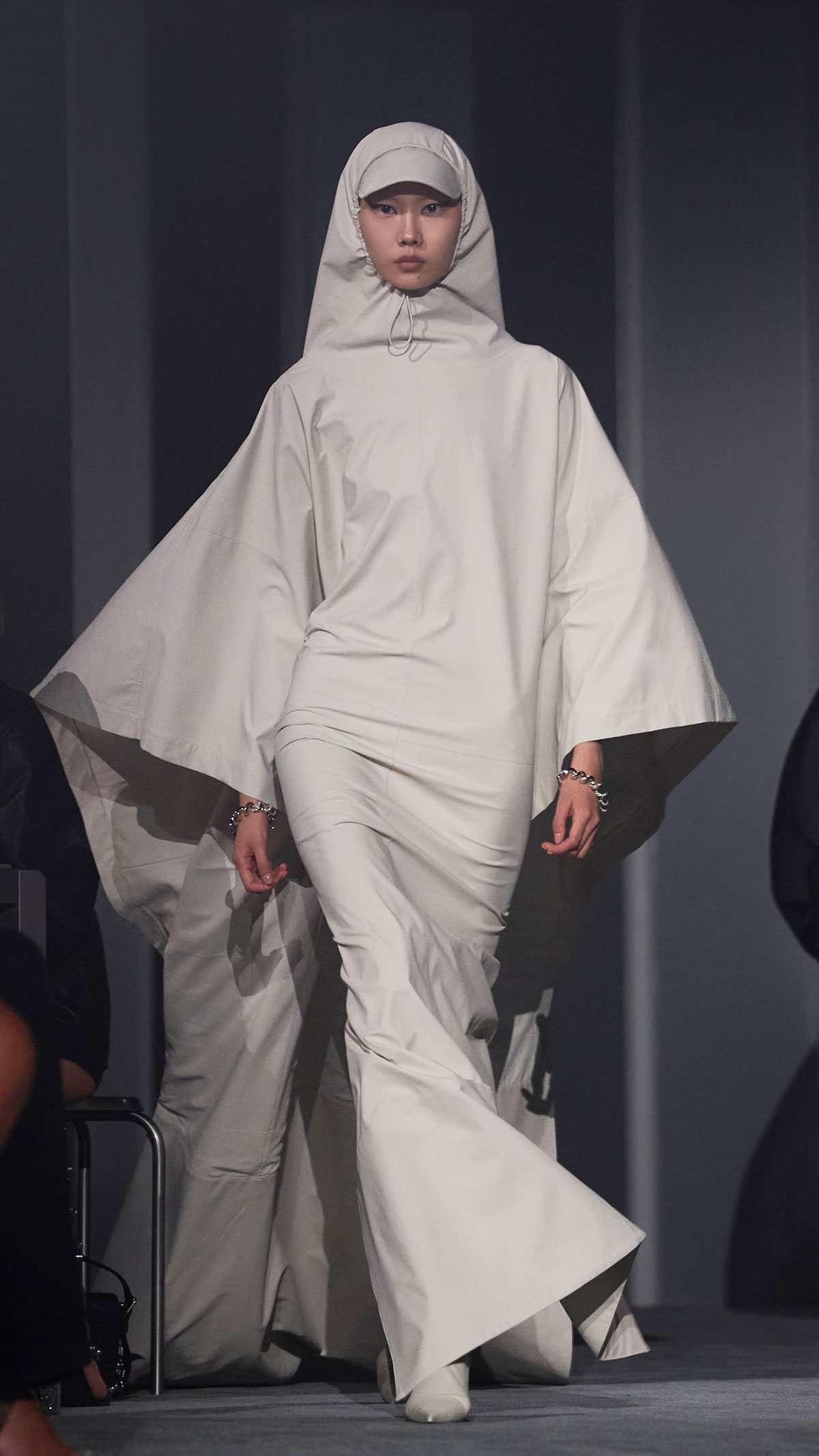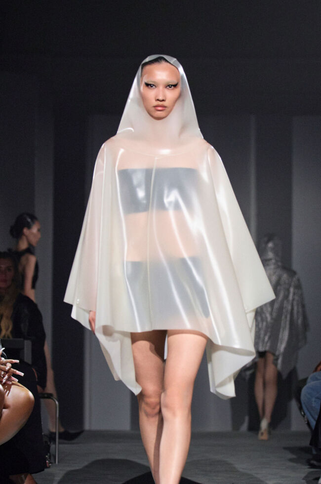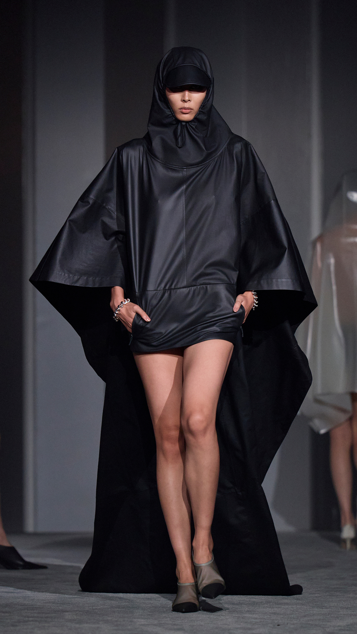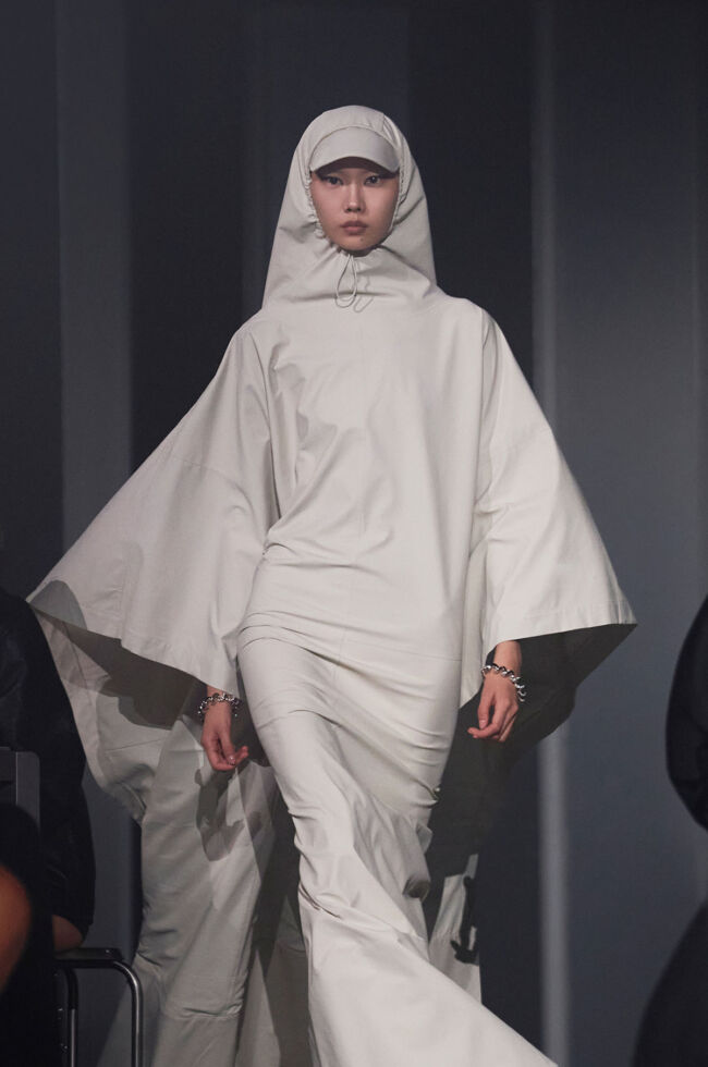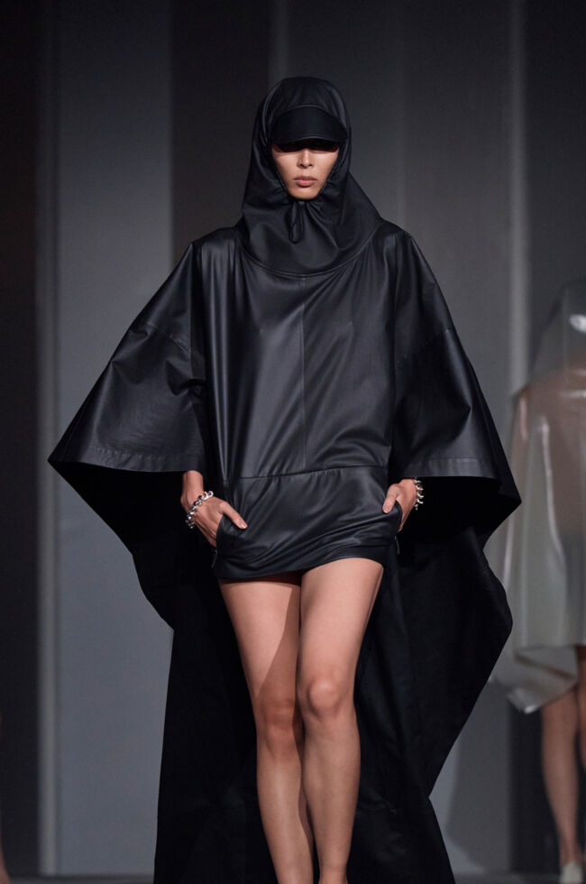 起業家のルーシー・グオと俳優のポム・クレメンティエフもモデルとしてランウェイに姿を見せた。バスト下やヒップで大胆にカットされたボンディングジャケット、メタリックにラミネート加工されステルスかつモダンな表情を纏ったツイード、クロシェ編みニットなど、多彩なルックが披露された。