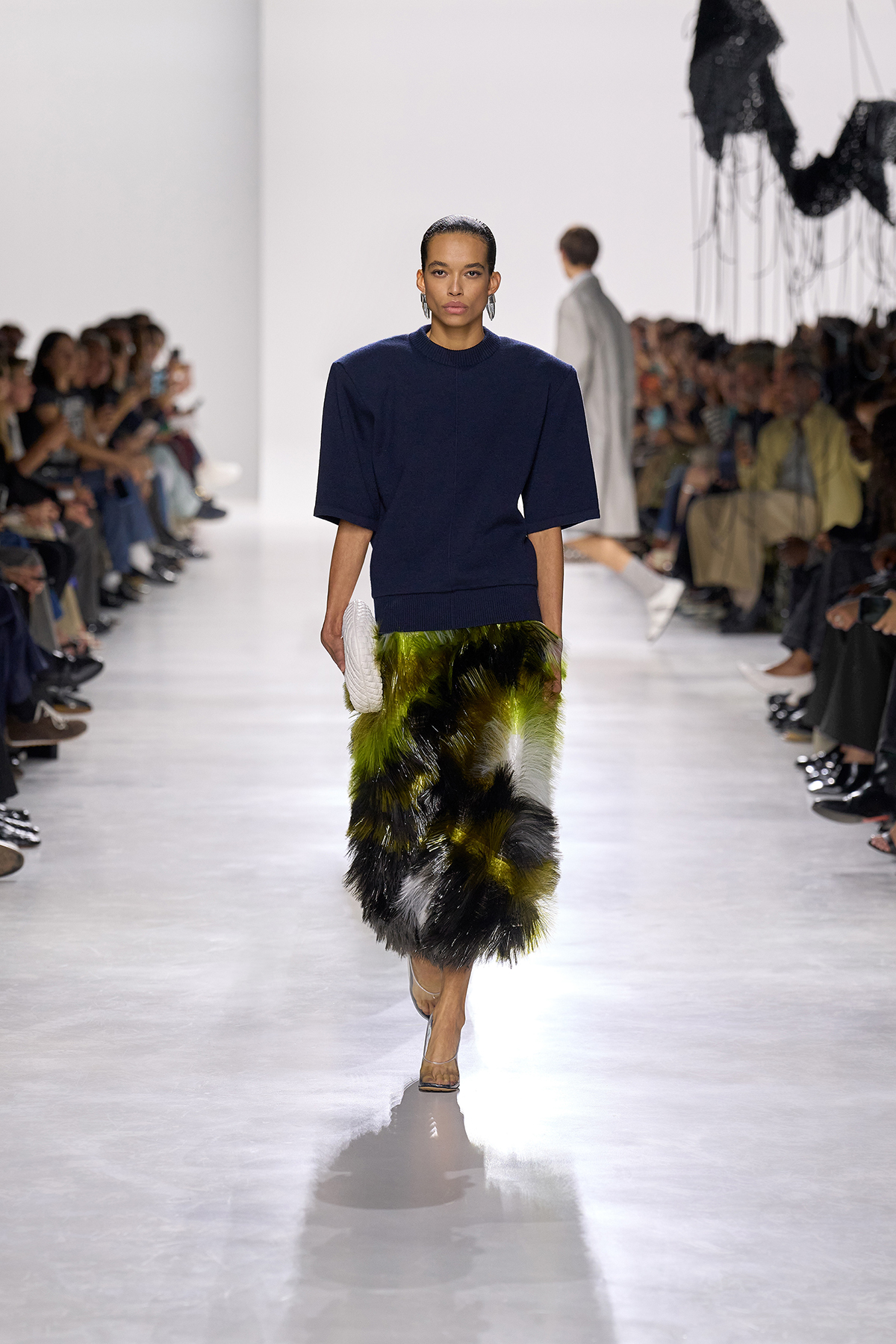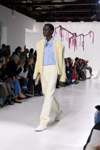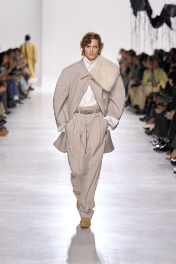 ランウェイには、サマーウールやコットン、ナッパレザーが織りなす軽やかで構築的なルックが次々と登場。メンズもウィメンズも、イタリア伝統のテーラリングをベースにしながら、ジャケットの裏地を覗かせたり、仕立てをあえて崩すなど、クラシックの中に新しい息吹を吹き込んだ。シルエットはのびやかで、時に流れるように、時に建築的。動きに合わせて光を反射するテクスチャーが、夏の空気を纏うかのように輝く。