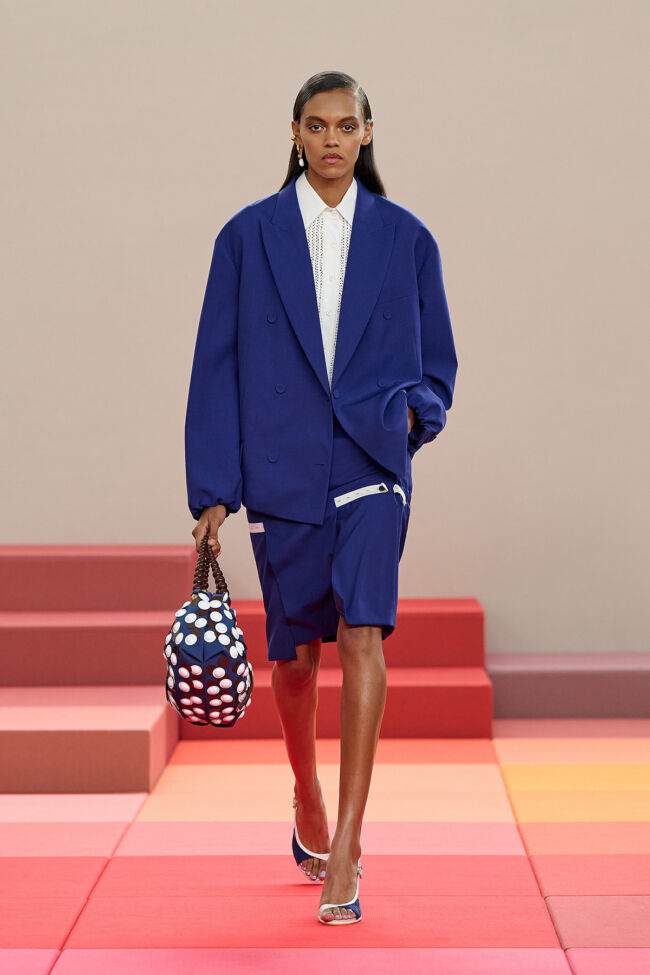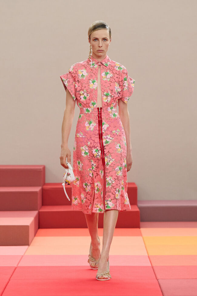フットウェアでは、カットアウェイのサンダルや格子細工のローファーが登場し、軽やかで洗練されたムードを強調。さらに、デルフィナ・デレトレズ・フェンディによるジュエリーがコレクションを彩り、遊び心とエレガンスを兼ね備えた仕上がりに。