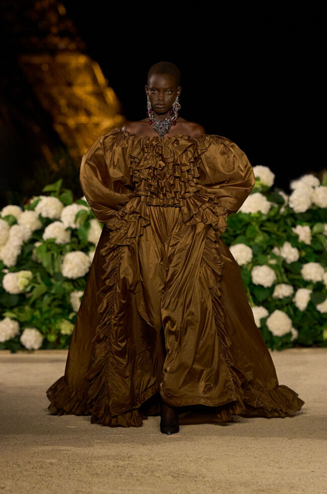 終盤は、ふんだんにラッフルやフリルをあしらったボリュームドレスが登場し、カラーもオレンジやグリーン、カーキなどのカラーパレットで展開された。
