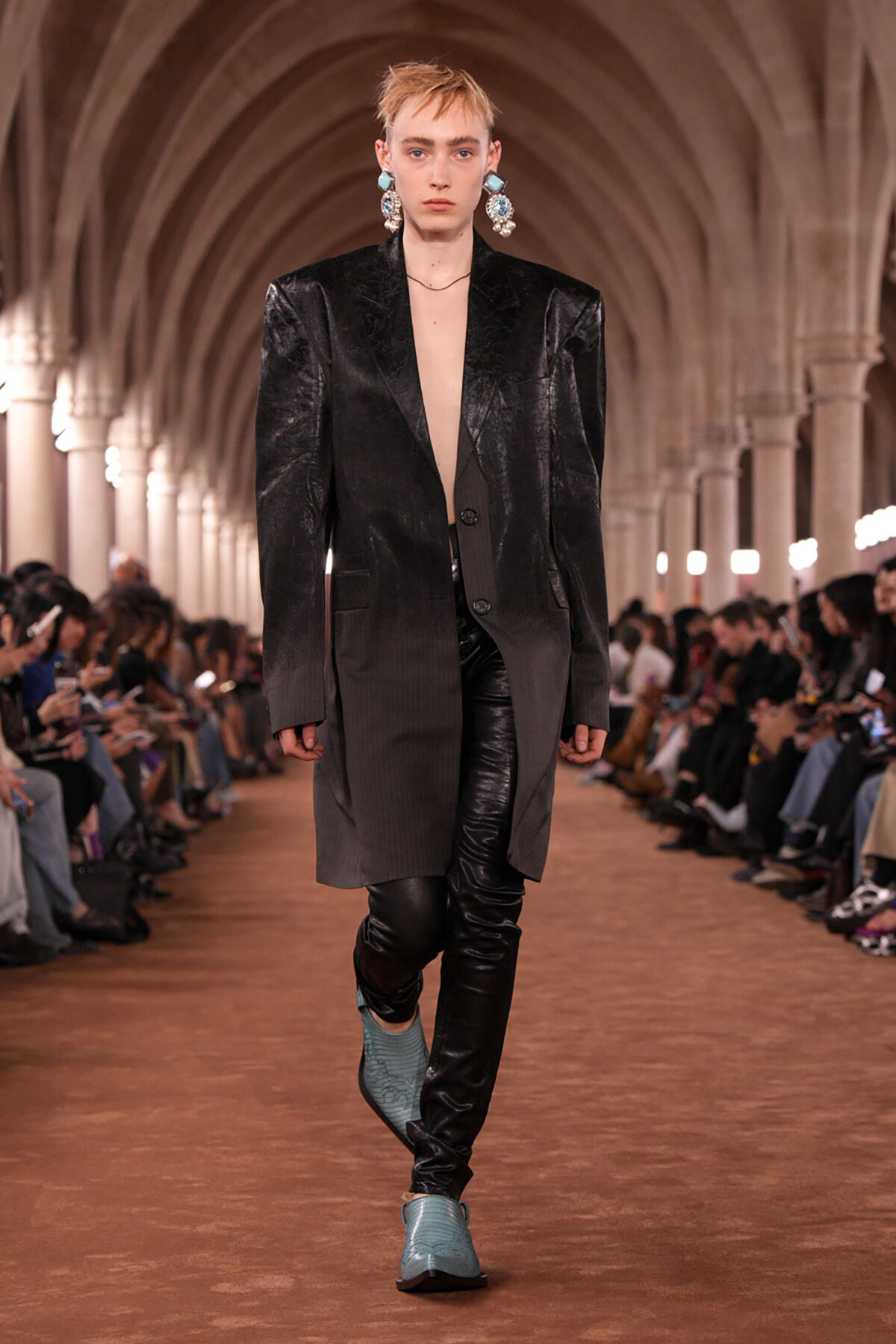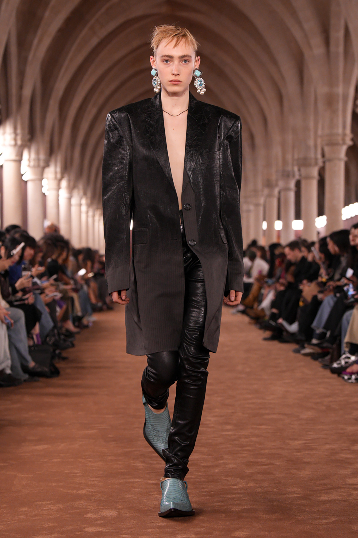 肩幅のあるスーツジャケットやユニフォームシャツなど、マスキュリンな要素が多く見られた今シーズン。長めのカウボーイブーツやラテックス加工でラバーのように仕上げられたボトムスのように、コレクション全体が中性的で力強いムードに包まれている。レザーやスエードは蝋引きやスプレーペイントによって加工され、ブランドらしい経年の美しさを際立たせる素材使いが存在感を放った。