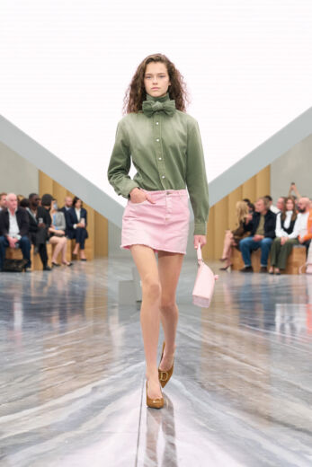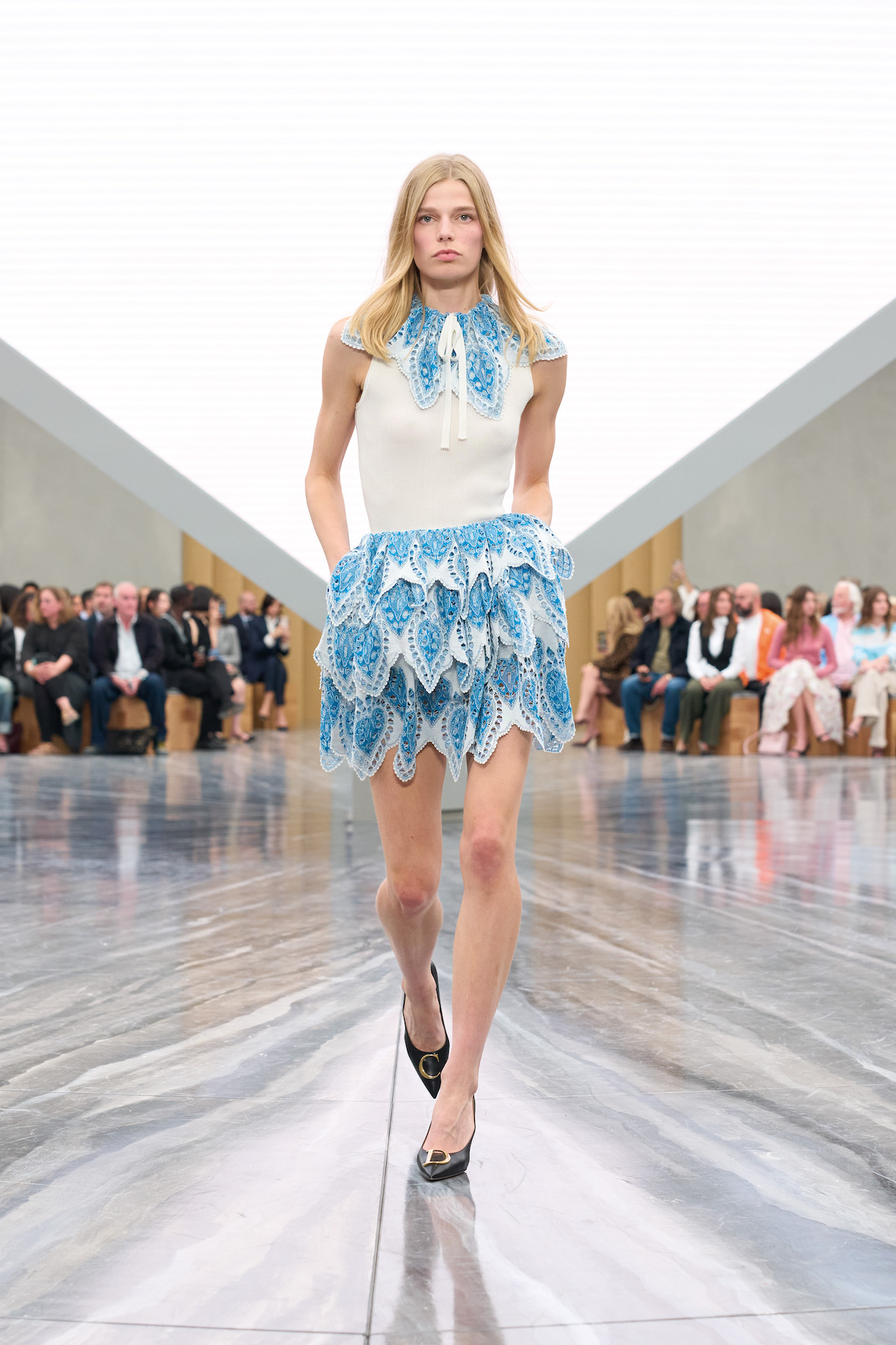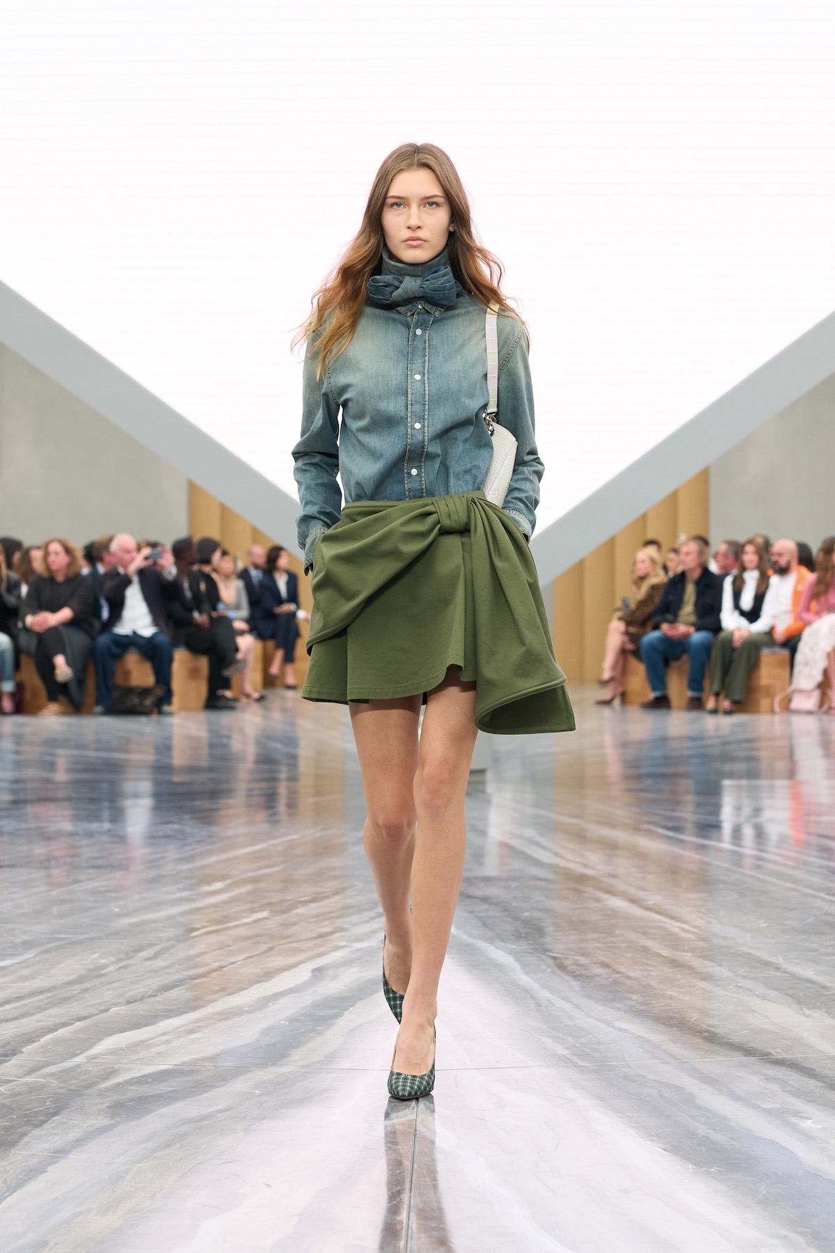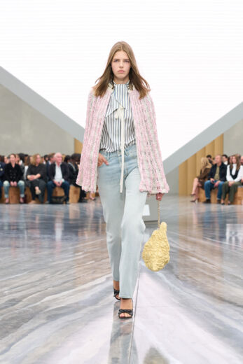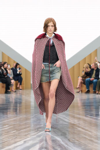 また、ポロシャツやデニムスカートといったカジュアルなアイテム群も、“変化”を印象付けるのには効果的であった。本コレクションを通じて「ドレスアップとカジュアルダウンという相反するものの駆け引き」を意識したとアンダーソン自身が語っていたように、裾が切りっぱなしになったデニムスカートには、端正なテーラードジャケットやリボンブラウスを合わせるなど、必ず品の良さを忍ばせている。色や編み柄など、バリエーションで魅せていたケープもノーブルなムード作りに一役買っており、フェード感の強いデニムスカートに合わせたロングケープは、籐の椅子から着想を得たディオールの代表的なパターン“カナージュ”を全面にあしらうなど、伝統的な意匠が品格を後押しするという点で奏功しているのは間違いない。