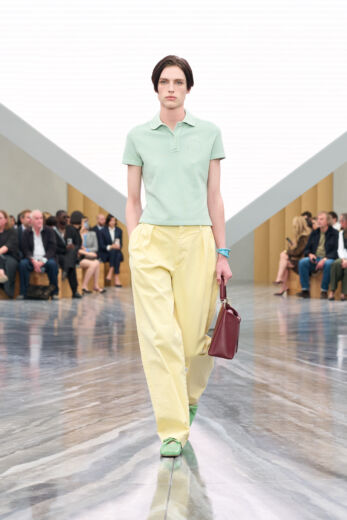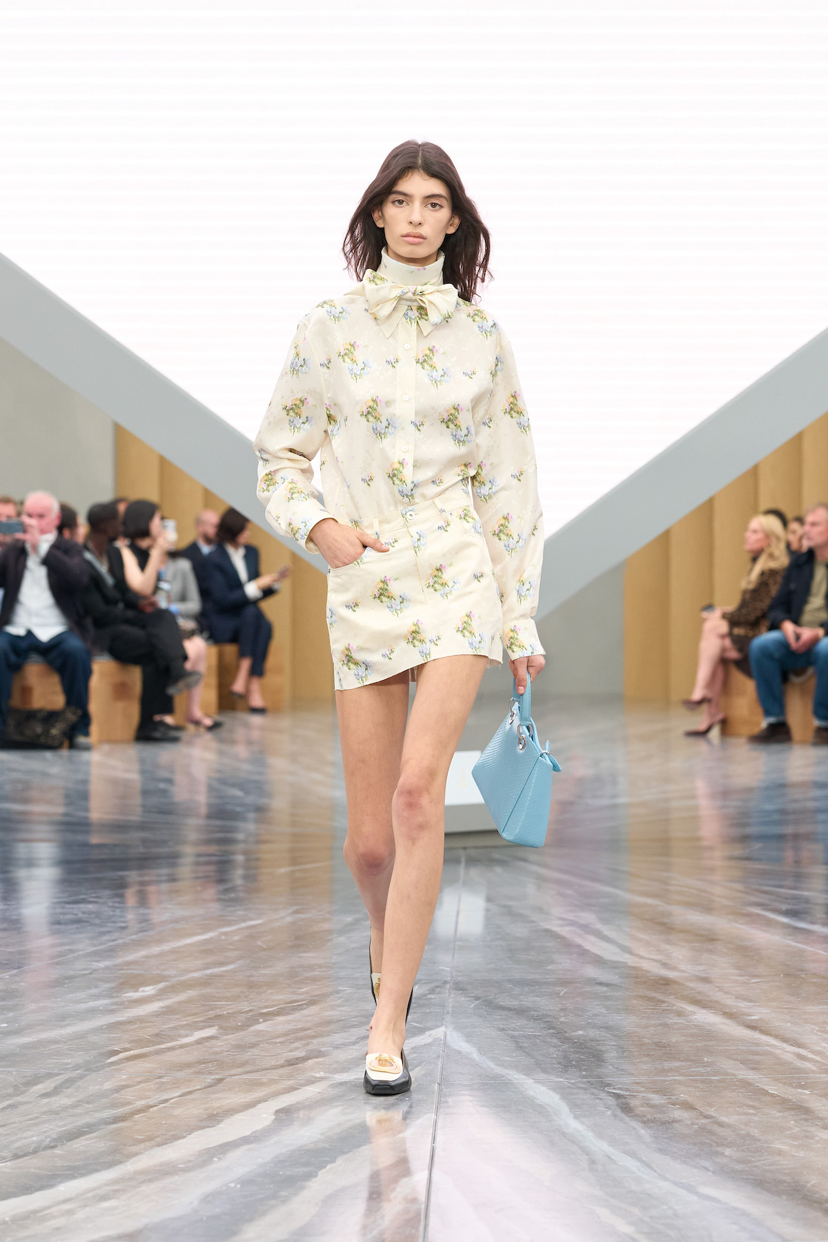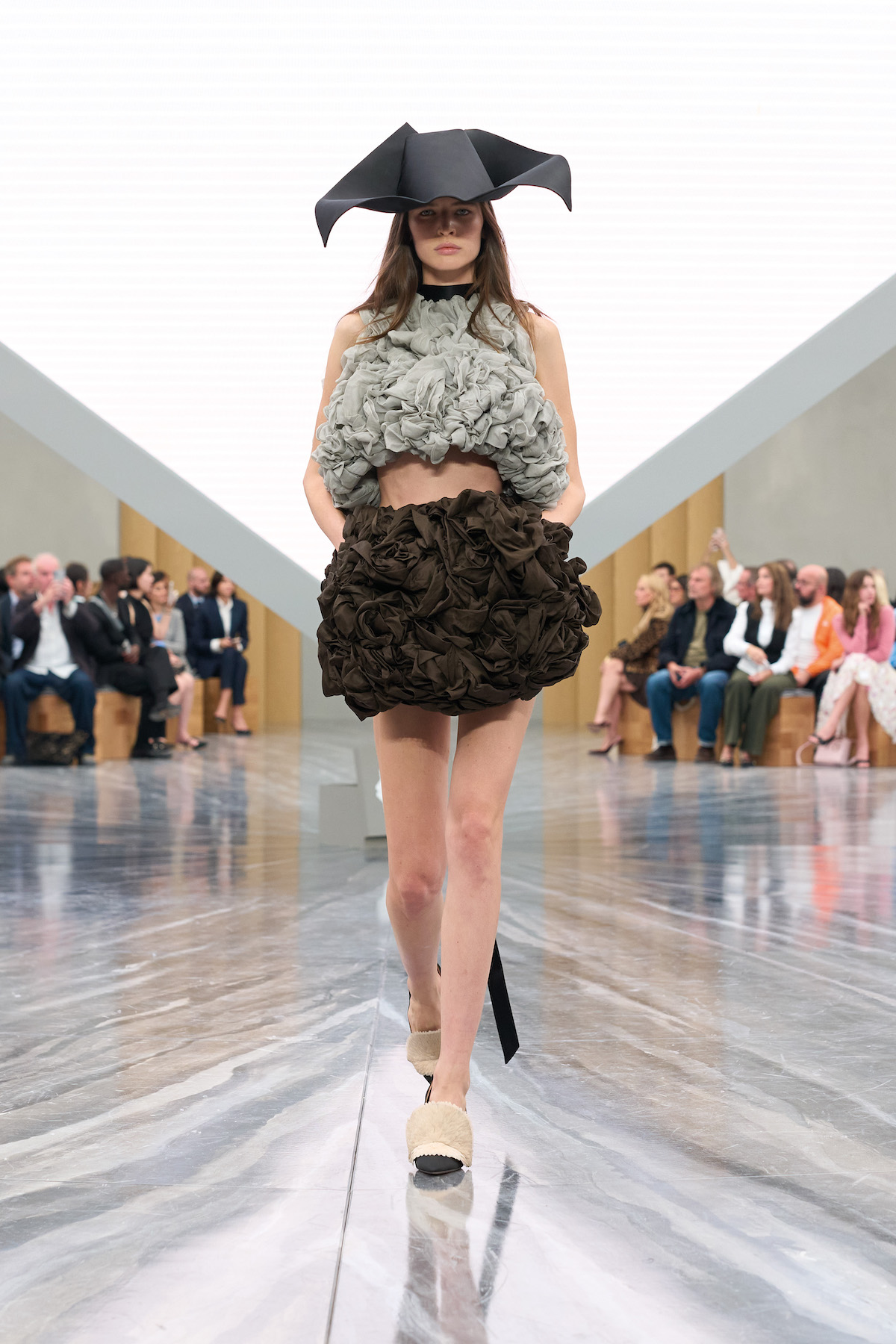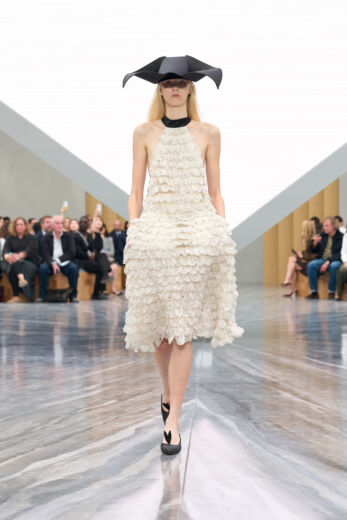 伝統に終始しないアンダーソンらしい個性も目立った。異形なフォルムもそのひとつ。短冊状のファブリックを編み込んで成型したバルーンシルエットのドレスやウエストラインからこぶのように大きく張り出したドレスは、ファッション(衣服)と身体性について問い直すかのよう。なかでも細かいプリーツが帯のように形作られ、裾に向かって不規則なドレープを描くワイドパンツとボウタイ付きのホワイトシャツを合わせたルックは、飾らないヘアメイクとの相性の良さも含めて目を惹いた。