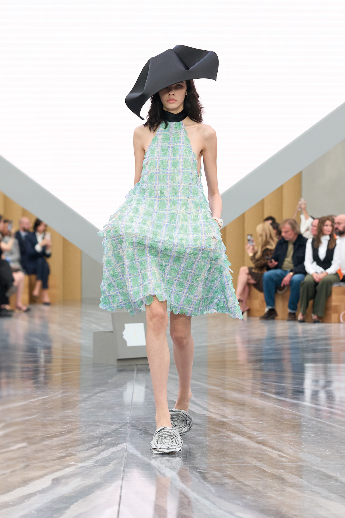 映像終了後に明転すると、ショーがスタート。ファーストルックはピュアホワイトのデイドレスで、身体のラインを横断するように2つのリボンが交わる。リボンやボウ(蝶々結び)のモチーフは、ムッシュ ディオールも愛した永遠のシンボルであり、前任者のマリア・グラツィア・キウリも多用していたモチーフのひとつ。本コレクションでもコットンドリルのミニスカートやレースのドレスのバックスタイルなど、ディテールの要所要所で散見された。また、序盤で登場したハットは、19世紀に航海士が被っていた帽子に倣ったもので、スティーブン・ジョーンズがデザインを手掛けた。かつて、キム・ジョーンズがディオール在籍時にも重用していたハットデザイナーの存在が、連綿と続くメゾンの歴史を感じさせる。このハットは、本コレクションを代表するキーピースのひとつとして、数多くのルックで採り入れられていた。