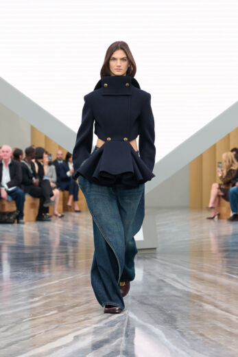 1952年秋冬コレクションで発表された「シガール」ドレスや、1949年オートクチュールコレクションが初出となる「ジュノン」ドレスもモダナイズされている。前者は、鋭角的に張り出したフォルムを総レースのドレスなどに転用。サヴォワールフェールが息衝く精緻なレースと構築的なシルエットが意外なコントラストを生み出す。また、孔雀の羽を思わせるブルーグリーンの花びらを重ねた傑作「ジュノン」ドレスは、ミニ丈のスカートやトップスの首元を飾るあしらいとして使われている。花弁をマキシサイズに変えて「ニュージュノン」として再解釈したキウリに比べると、やや控えめなアレンジにも映るが、荘厳な雰囲気のオリジナルに対し、ヘルシーなミニ丈のドレスにすることでコンテンポラリーに昇華している。こうした時代の空気を的確に捉えたバランス感覚もまたアンダーソンの持ち味だろう。他にも、メンズコレクションで先駆けて発表された1948年春夏コレクションのドレス「カプリス」のシルエットを模したデニムパンツは、今回ウィメンズでも登場。先述した「バー」ジャケットを含めて、性差を問わない共通のデザインやディテールも本コレクションの特徴と言えよう。