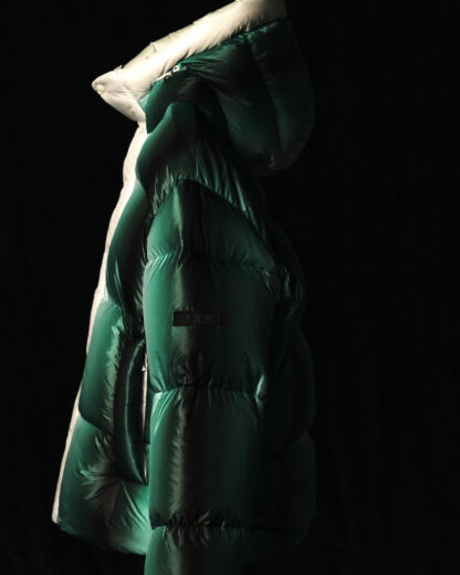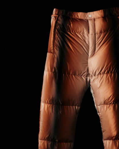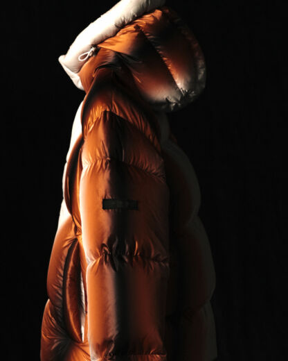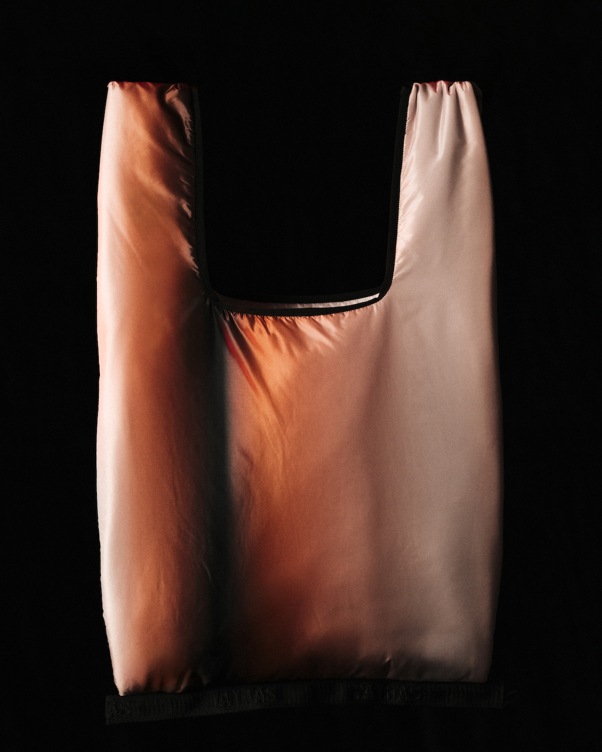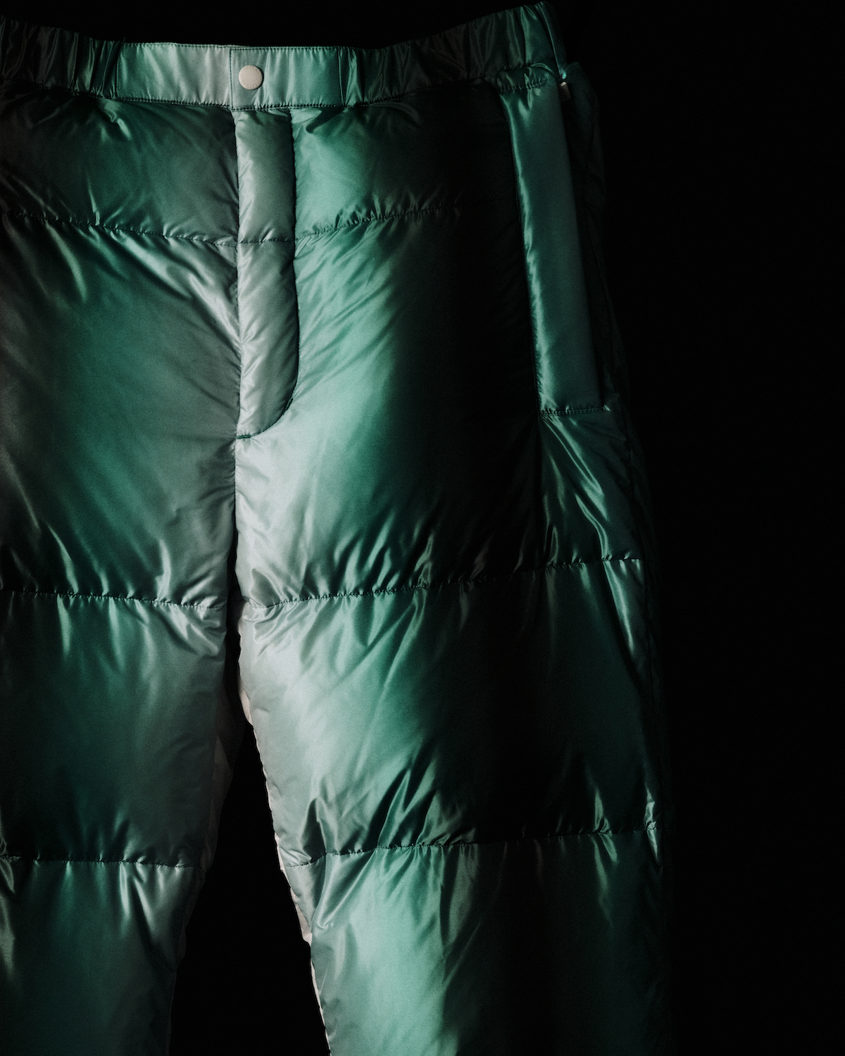 カプセルコレクションは、ダウンジャケット、ダウンパンツ、バッグの3アイテムがラインナップ。それぞれオレンジとグリーンを基調とした重層的かつ優美なグラデーションとコンテンポラリーなスタイルに、日本の伝統とモダニティの邂逅が見て取れる。ヨシロットンは、近年におけるシグネチャーのひとつ「SUN」シリーズに象徴されるように、光、時間、文化などを「レイヤー」として視覚的に表現しており、タトラスが掲げるテーマ“伝統の現代的再構築”と共鳴したことも、創作の一端になっていると言う。
