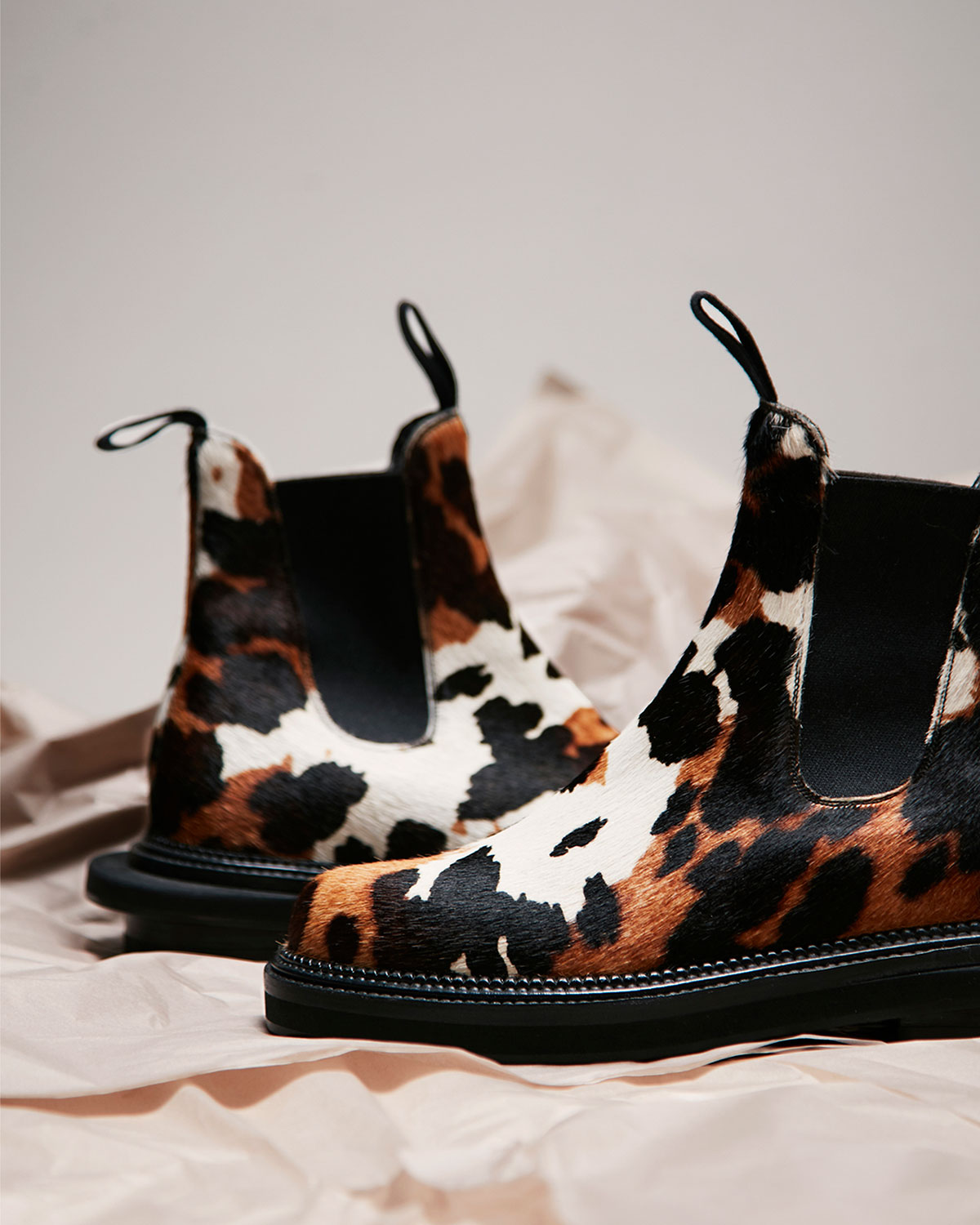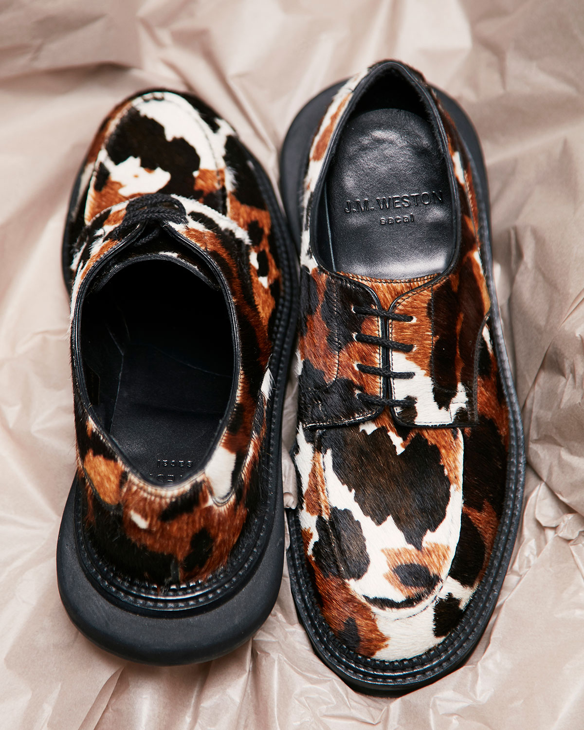 ジェイエムウエストンを象徴する3つのモデル、シグニチャーローファー #180、ゴルフ #641、そしてサイドゴアブーツを再解釈し、それぞれアッパーにはプリント加⼯を施したカウハイドレザーを使⽤している。