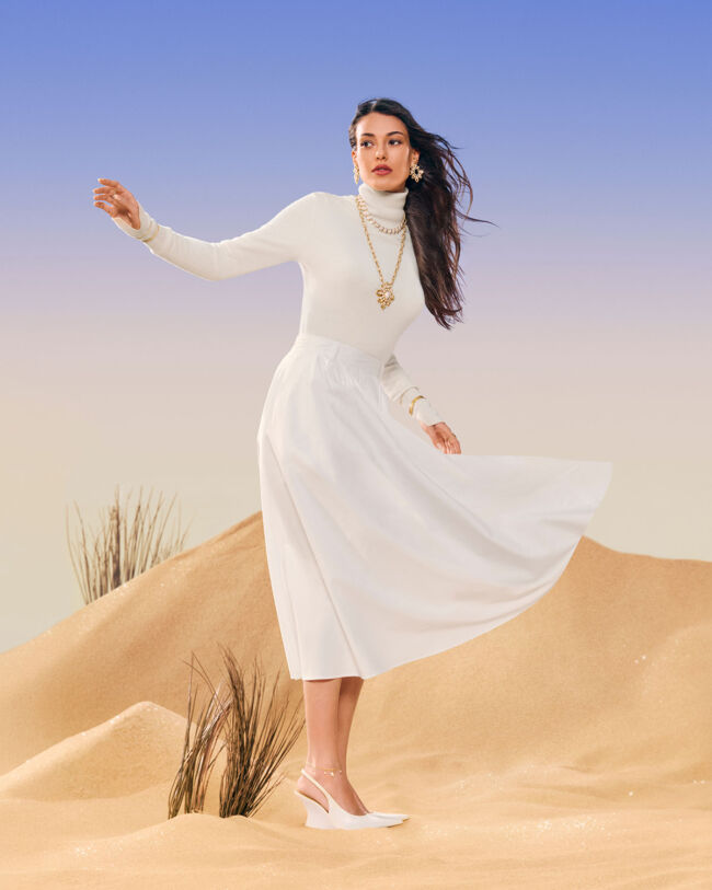黄金色に染まる砂漠を背景に、ディラン・チチェク・デニスは「セルパンボエム」と「キャトル」を身につけてポーズ。タイムレスで洗練されたジュエリーが、彼女のパーソナリティを美しく引き立たせる。