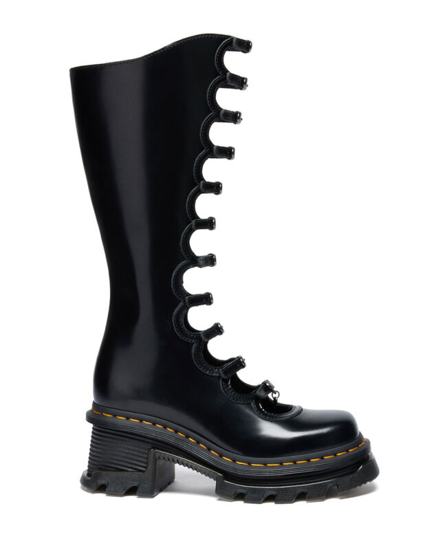 2016年秋冬コレクションのランウェイに初めて登場したキキ ブーツは、大胆なバックルや際立つシルエット、エッジの効いたデザインでブランドのアイコンとして知られるようになった。今回のコラボレーションでは、ドクターマーチンを象徴する「Corranヒールソール」を採用し、よりインダストリアルで力強い存在感を放つデザインへとアップデート。マーク ジェイコブスとドクターマーチン両者の個性が融合した一足が完成した。
