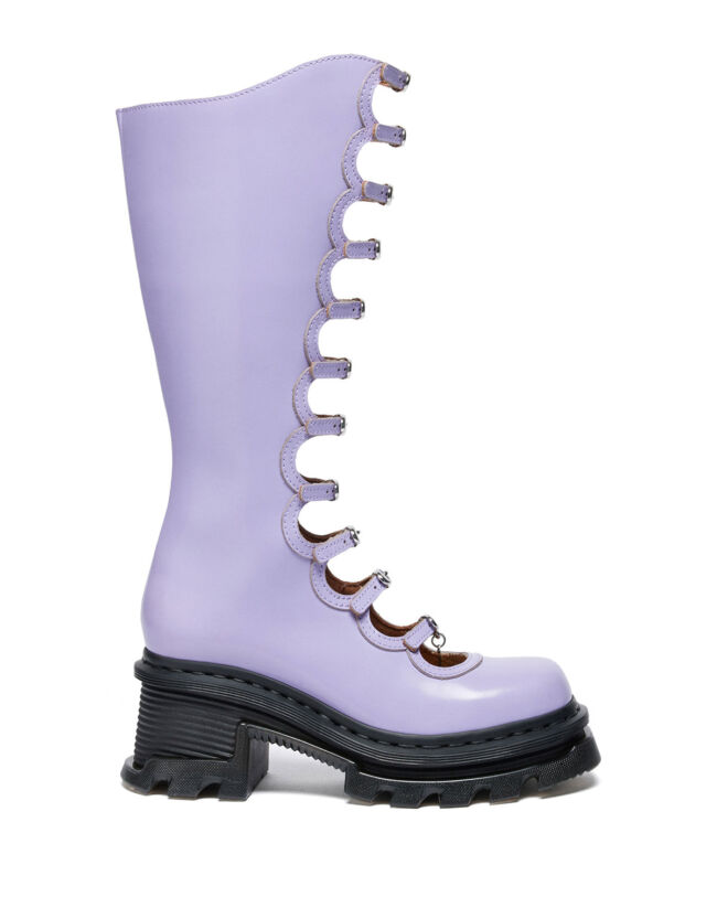 コレクションは、ドクターマーチンの定番レザーであるハイシャインの「ブッテロレザー」を使用したブラックとブライトラベンダーの2色を展開。しなやかで上質な質感が特徴のレザーで、クラシックで落ち着いた印象を与えながらも、マーク ジェイコブスらしい遊び心あふれるカラーにより、ブーツの持つアヴァンギャルドな魅力をさらに引き立てている。