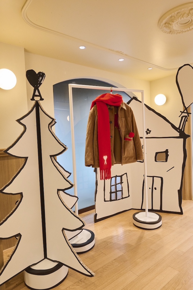このポップアップストアは、一年を通して三つの物語で構成される進化型の空間。第一章「A Magical World」では、“大人になっても心の中の子どもは消えない”というアミ パリスのスピリットを表現している。その象徴となるのが、ファサード中央に佇む“小さな男の子”のオブジェ。手にした赤いバルーンは、アルベール・ラモリス監督の名作短編『赤い風船(Le Ballon Rouge)』へのオマージュだ。 創設者アレクサンドル・マテュッシの幼少期の記憶を宿すその姿は、ブランドが紡ぐロマンティックで人間味あふれる世界観を映し出している。