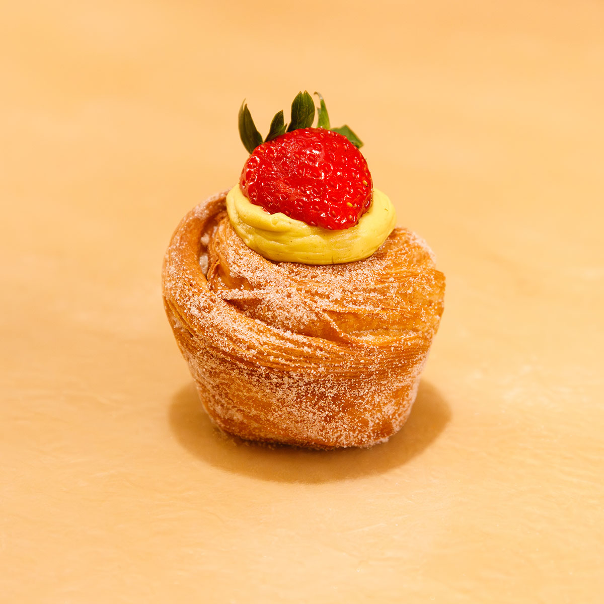 少し背の低い「デコ(DECO)」は、上にトッピングされた食材の彩りや食感、アレンジが楽しめるシリーズ。マスカルポーネクリームではなく、カスタードクリームを使用した「ティラミス」や、ピスタチオの香ばしい味わいが引き立つクリームに、いちごジャムを合わせ、トップにフレッシュな国産苺をトッピングした「ピスタチオ&苺」など、トップをデコレーションしたスタイルのクリームクロワッサンになっている。
