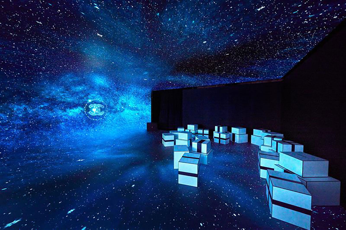 次に広がるのは、シャネルの星空へと旅立つ4D体験空間。左右の壁と床にLEDスクリーンが設置されたスペースで、大きなギフトボックスに腰掛けて特別な旅に出発。夜のフレンチガーデンから、街を通り、雲を抜けて、シャネルの星空へ。まるで実際にその場にいるような没入体験が待っている。