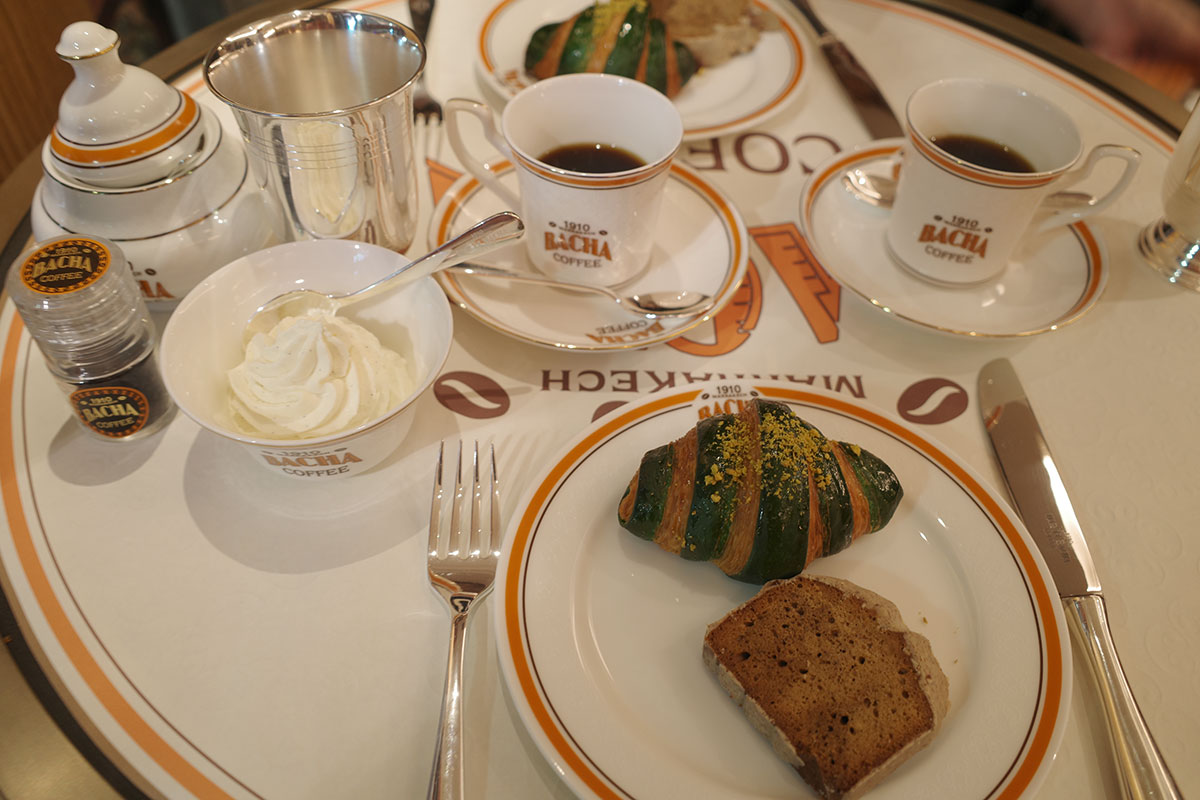 2階と3階のコーヒールームは、全40席を用意。コーヒーとのペアリングを考えられたメニューをラインナップし、モロッコの伝統料理をはじめ、フレンチトーストサンドイッチや卵料理などの食事はもちろん、シグネチャーのクロワッサンやパウンドケーキ、生ケーキなどのスイーツも充実。エスプレッソやラテは提供せずに、ゴールドのグースネックポットで一杯ずつ丁寧にコーヒーを淹れて提供する。