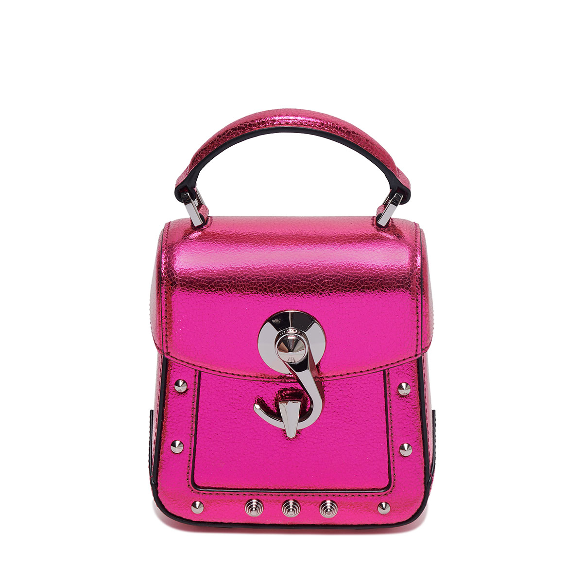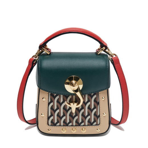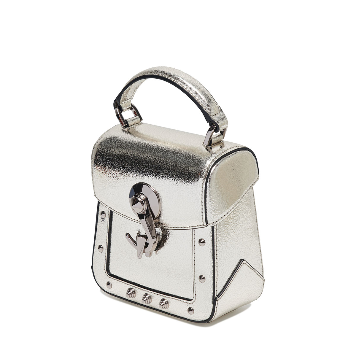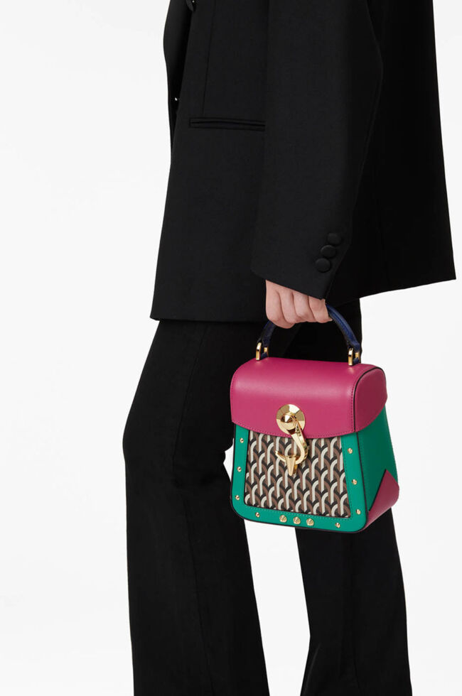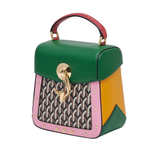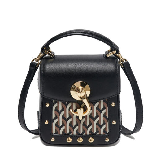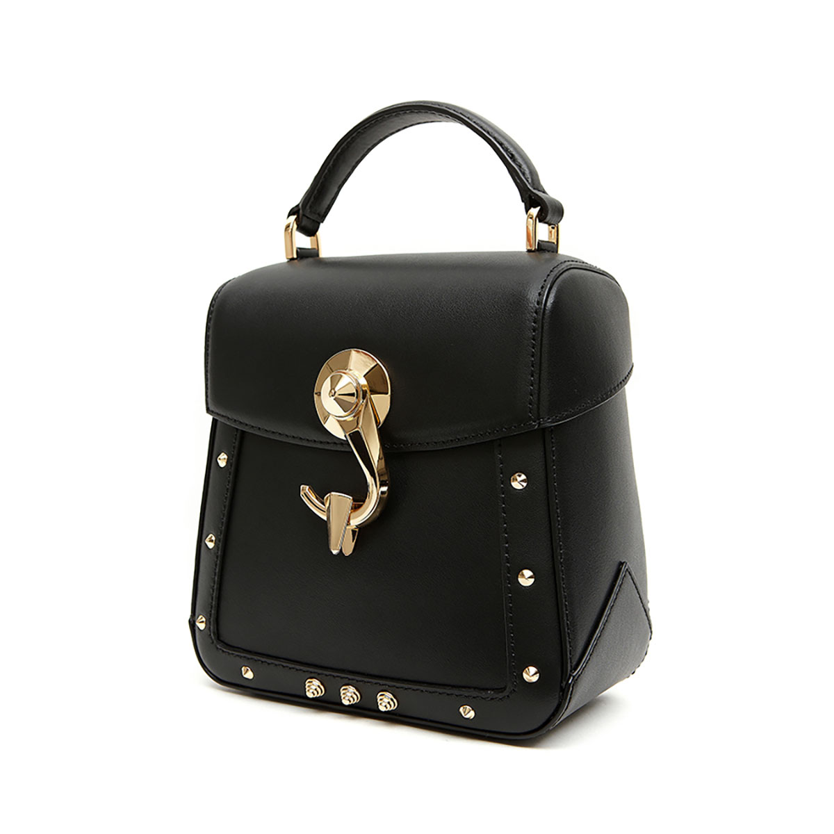 スクエア型の端正なワンハンドルバック「Trunkino」。フック型のクロージャーでスマートに開閉でき、スタッズのあしらいがモード感を引き立てる。こちらもストラップを装着すれば、ショルダーバッグとして使える2Way仕様となっている。