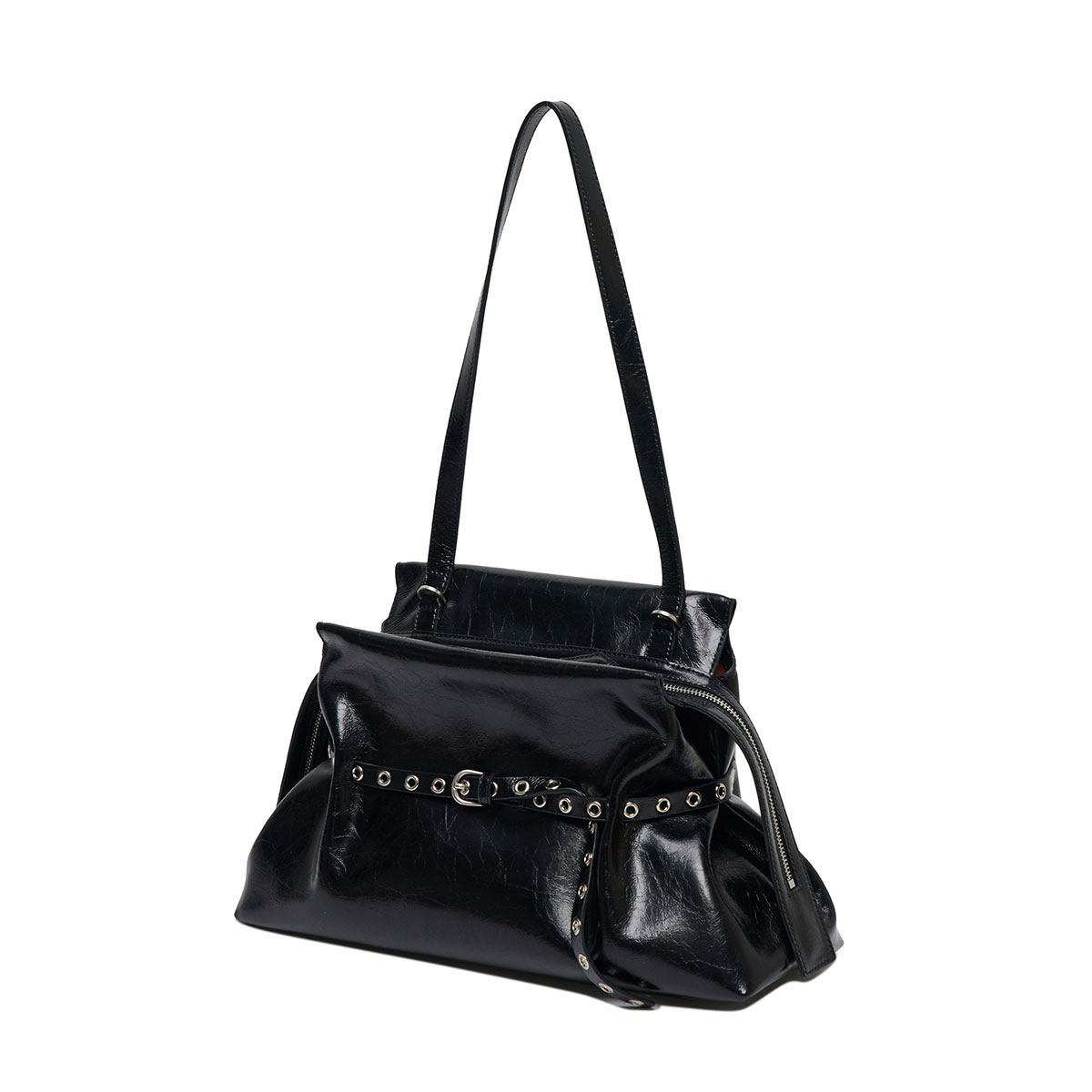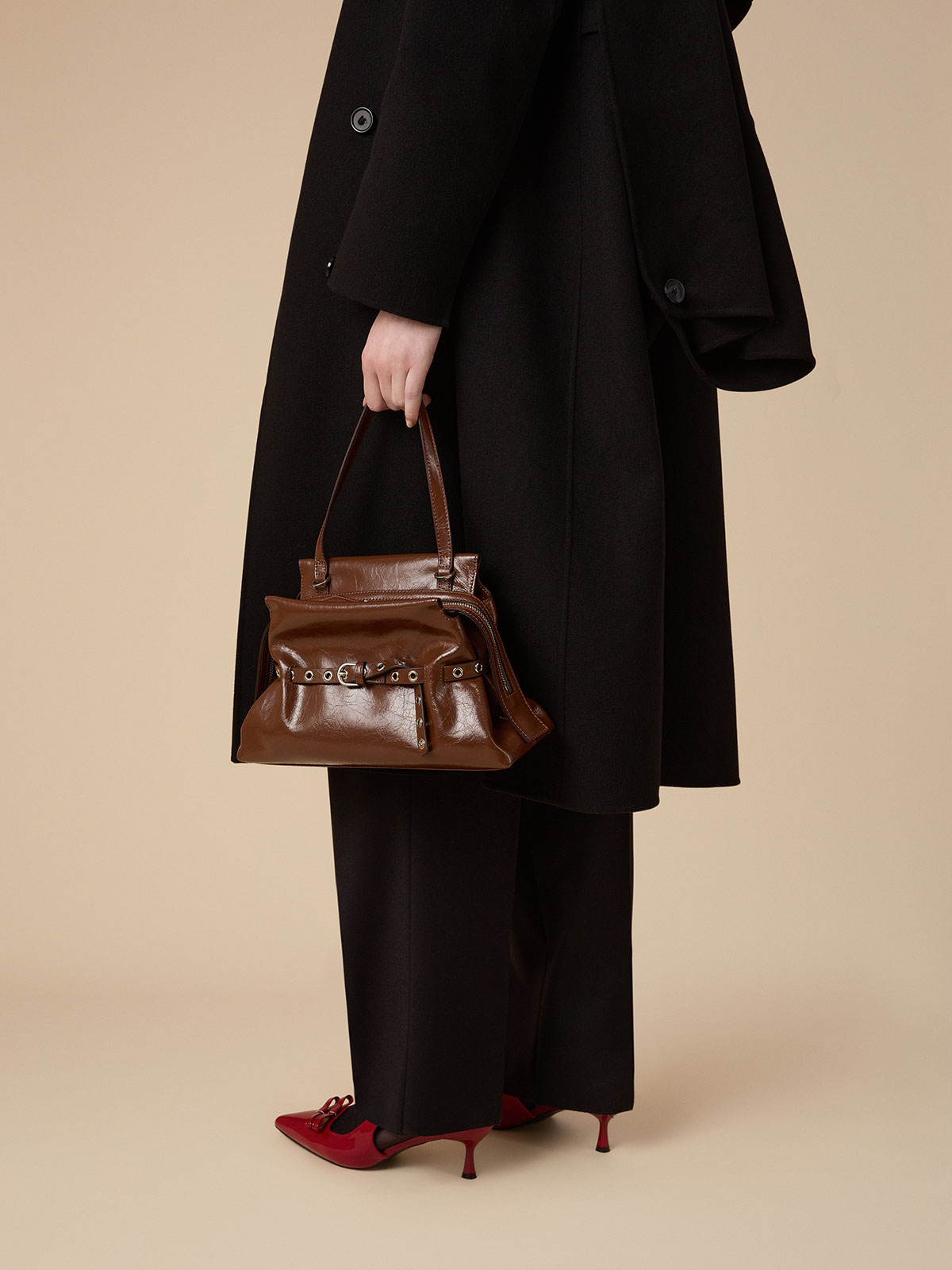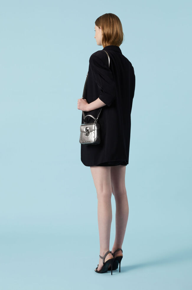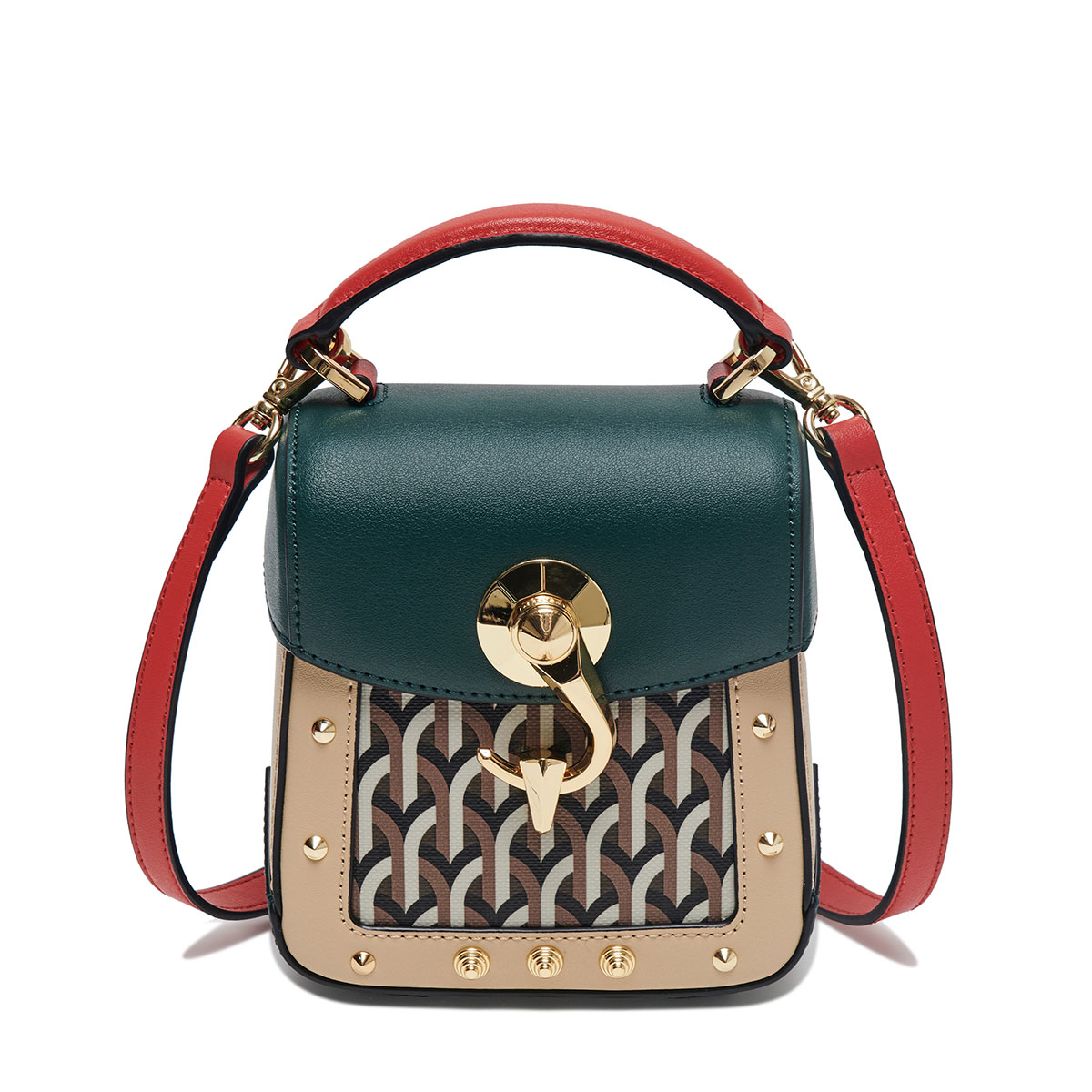 スクエア型の端正なワンハンドルバック「Trunkino」。フック型のクロージャーでスマートに開閉でき、スタッズのあしらいがモード感を引き立てる。こちらもストラップを装着すれば、ショルダーバッグとして使える2Way仕様となっている。