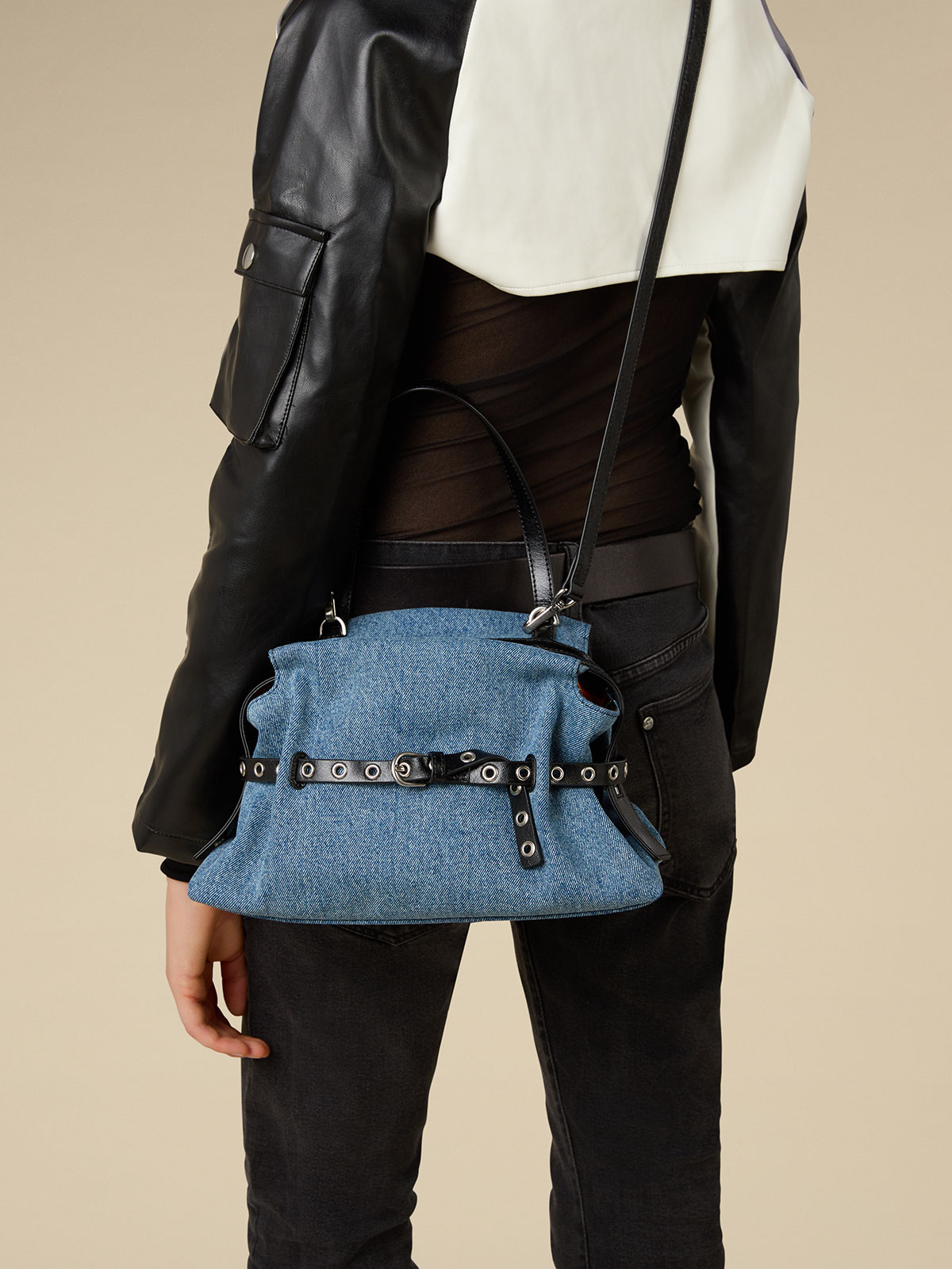 ブラックとブラウンのレザーは牛革を使用したしっとりとした質感で、デニム地にブラックのレザーを合わせたタイプもラインナップ。サイズはそれぞれスモールとミディアムを展開し、ブラックとブラウンはラージも用意。